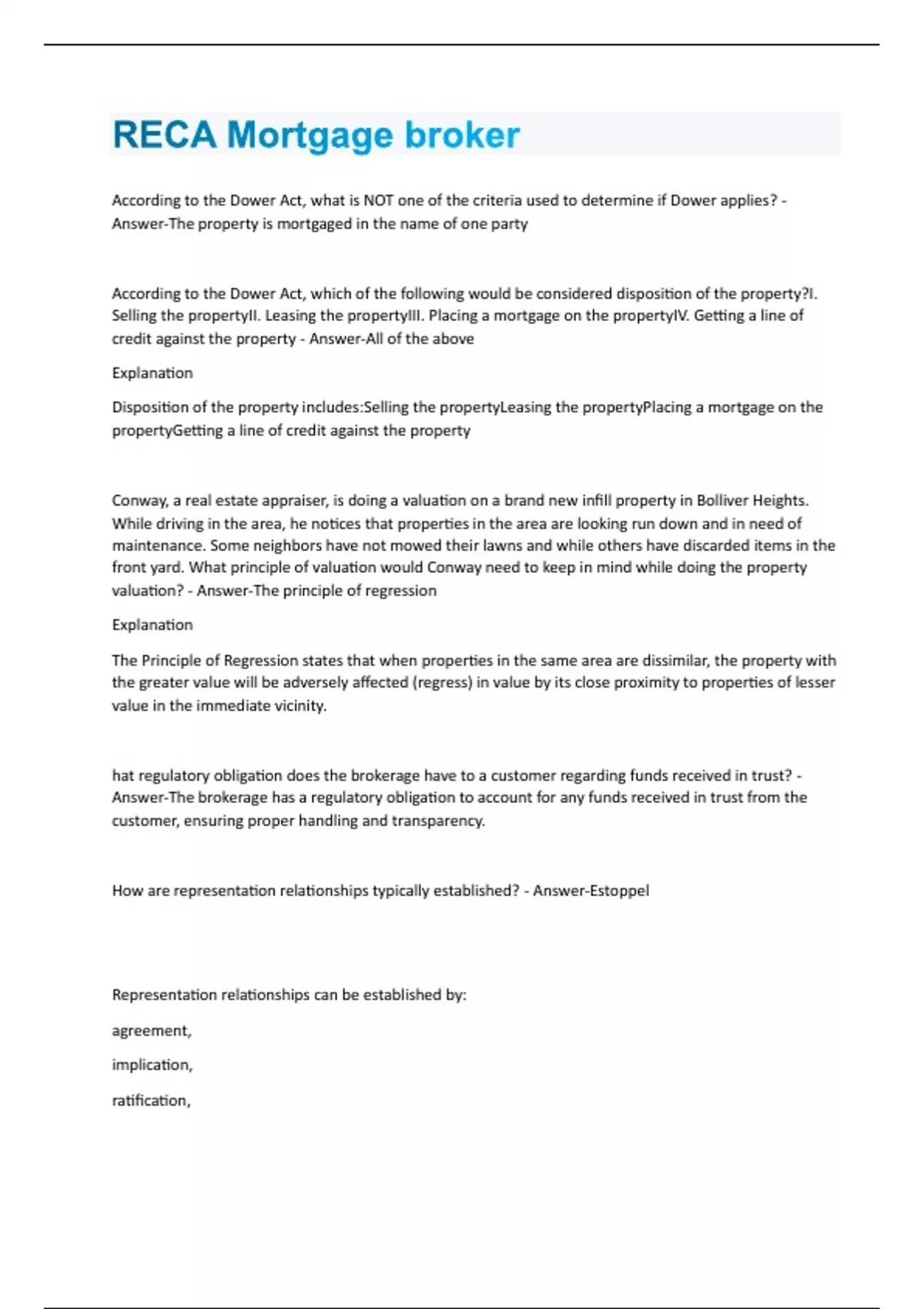 According to the Dower Act, what is NOT one of the criteria used to determine if Dower applies? - Answer-The property is mortgaged in the name of one party According to the Dower Act, which of the following would be considered disposition of the property?I. Selling the propertyII. Leasing the propertyIII. Placing a mortgage on the propertyIV. Getting a line of credit against the property - Answer-All of the above Explanation Disposition of the property includes:Selling the propertyLeasing the propertyPlacing a mortgage on the propertyGetting a line of credit against the property Conway, a real estate appraiser, is doing a valuation on a brand new infill property in Bolliver Heights. While driving in the area, he notices that properties in the area are looking run down and in need of maintenance. Some neighbors have not mowed their lawns and while others have discarded items in the front yard. What principle of valuation would Conway need to keep in mind while doing the property valuation? - Answer-The principle of regression Explanation The Principle of Regression states that when properties in the same area are dissimilar, the property with the greater value will be adversely affected (regress) in value by its close proximity to properties of lesser value in the immediate vicinity. hat regulatory obligation does the brokerage have to a customer regarding funds received in trust? - Answer-The brokerage has a regulatory obligation to account for any funds received in trust from the customer, ensuring proper handling and transparency. How are representation relationships typically established? - Answer-Estoppel Representation relationships can be established by: agreement, implication, ratification,estoppel, or operation of law How can a licensee ensure that they meet the standard of care expected of them? - Answer-Licensees can ensure that they meet the standard of care expected of them by: practicing being a lifelong learner, seeking advice when appropriate, and being aware of market/practice issues If the contract ends because it becomes impossible to perform the contract due to unanticipated circumstances, what is this type of contract termination called? - Answer-Frustration Explanation A frustrated contract is a contract that, after its formation, without fault to either party, is incapable of being fulfilled due to an unforeseen event or series of events that was not expressed in the contract. An example of frustration is when a brokerage has a property listed for sale and the house is destroyed by fire. In this case, the existing contract is terminated because there is no property as described in the agreement to sell. Oscar, a mortgage professional, is completing a mortgage application with Lydia who has just purchased an investment property subject to financing. As part of the application process, Omar must obtain income verification details on Lydia's employment. What type of consent does Oscar need to collect this information? - Answer-Express consent Explanation Mortgage professionals should always receive the borrower's express written consent prior to collecting their personal and financial information, obtaining their credit reports and providing the information to potential lenders. Sonia is a real estate professional helping her buyer, Hailey, purchase a property. Hailey hires a qualified home inspector, Henry, to perform a property inspection on the house she is considering purchasing. After conducting the property inspection and providing the inspection report Henry sends Hailey the invoice. What type of contract has Hailey entered into with Henry? - Answer-Implied contract Explanation An implied contract is a legally enforceable agreement that arises from the actions or intentions (i.e. non-verbal conduct) of the parties involved which suggests that they are acting under an agreement.Buyer Hailey should expect to be charged for the work and the home inspector should be expected to be paid. Therefore, an implied contract to pay the reasonable value of the services rendered exists. Two years ago Peter purchased a fourplex valued at $650,000. Last year the city announced that it is building a large recreational centre 3 blocks from the fourplex. A real estate agent tell Peter that his fourplex is now worth $800,000.Which principle of property valuation is described in this scenario? - Answer-The principle of external factors Explanation The Principle of External Factors states that various external factors can impact the value of a property, including economic, political, social, and physical issues. The value of Peter's property has increased due to the convenient location to the new recreation centre. What are the different types of condominium plans that may be registered with Alberta Land Titles?I. Conventional Condominium PlansII. Conventional Blended Condominium PlansIII. Bare land Condominium PlansIV. Barely Blended Condominium Plans - Answer-The Condominium Property Act describes three different types of Condominium Plans that may be registered with Alberta Land Titles. These include: Conventional Condominium Plans Bare land Condominium Plans Barely Blended Condominium Plans