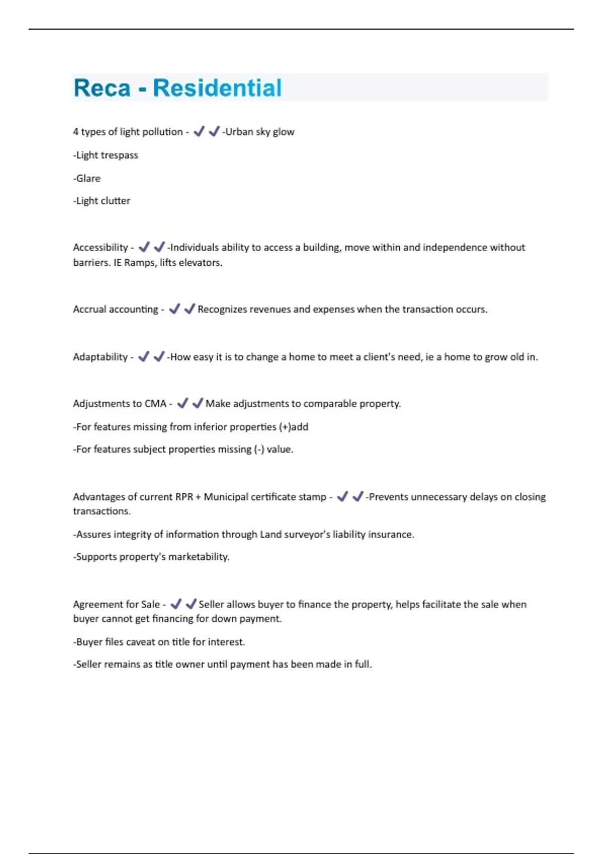 4 types of light pollution - -Urban sky glow -Light trespass -Glare -Light clutter Accessibility - -Individuals ability to access a building, move within and independence without barriers. IE Ramps, lifts elevators. Accrual accounting - Recognizes revenues and expenses when the transaction occurs. Adaptability - -How easy it is to change a home to meet a client's need, ie a home to grow old in. Adjustments to CMA - Make adjustments to comparable property. -For features missing from inferior properties (+)add -For features subject properties missing (-) value. Advantages of current RPR + Municipal certificate stamp - -Prevents unnecessary delays on closing transactions. -Assures integrity of information through Land surveyor's liability insurance. -Supports property's marketability. Agreement for Sale - Seller allows buyer to finance the property, helps facilitate the sale when buyer cannot get financing for down payment. -Buyer files caveat on title for interest. -Seller remains as title owner until payment has been made in full.Alberta Township System Description - Meridian/Range/Township/Section/Quarter Section/Legal Subdivision ie. LSD1-17-42-1-W5 (subdivision 1, section17, township 42, range 1, west of 5th Meridian) Amortization - The reduction of a loan balance through payments made over a period of time. Amortization period - The length of time it takes to repay a loan in full based on constant blended payments. Asbestos - Silicate minerals that naturally form in host rocks. -Health risk occur when they become air-born and are inhaled. Assemblage - Purchase of contiguous lots by same buyer(s), with intent to create single larger site with enhanced development potential. -Involves efforts to change applicable land use bylaws if it limits or restricts property owner's intended (re)development of the land.