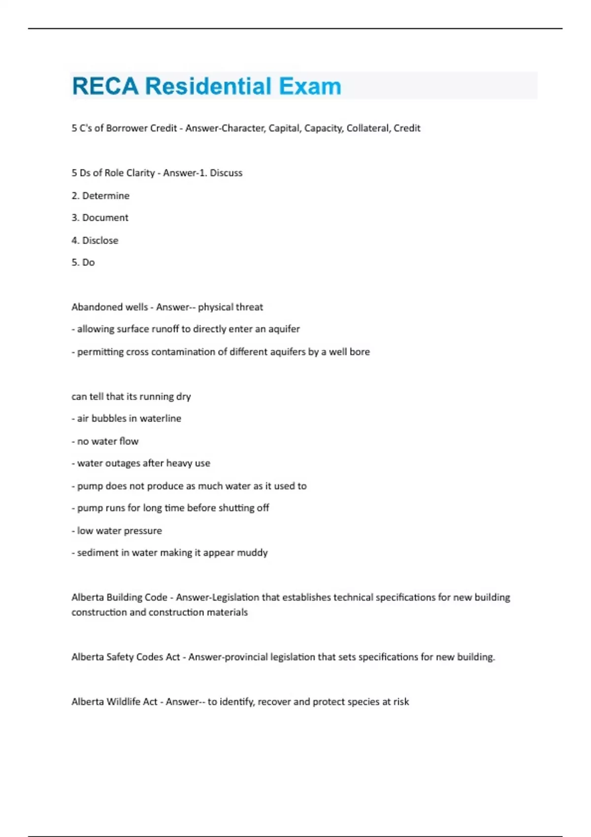 5 C's of Borrower Credit - Answer-Character, Capital, Capacity, Collateral, Credit 5 Ds of Role Clarity - Answer-1. Discuss 2. Determine 3. Document 4. Disclose 5. Do Abandoned wells - Answer-- physical threat - allowing surface runoff to directly enter an aquifer - permitting cross contamination of different aquifers by a well bore can tell that its running dry - air bubbles in waterline - no water flow - water outages after heavy use - pump does not produce as much water as it used to - pump runs for long time before shutting off - low water pressure - sediment in water making it appear muddy Alberta Building Code - Answer-Legislation that establishes technical specifications for new building construction and construction materials Alberta Safety Codes Act - Answer-provincial legislation that sets specifications for new building. Alberta Wildlife Act - Answer-- to identify, recover and protect species at riskAlternative energy sources - Answer-- solar panels - wind energy - solar shingles - geothermal energy systems Borrower vs Lender - Answer-Borrower obligations - repay mortgage and loan interest - keep property adequately insured - maintain the condition of the property - pay any charges against the title Rights - possession of property - redeem or further mortgage the property - receive a discharge of the mortgage Lender Obligations - discharge the mortgage upon payment - Not interfere with borrowers use of property - Provide annual statement of principal, interest and taxes Rights - assign the mortgage - be paid under terms of mortgage Building Floors - Answer-Beams - structural components that create base Joist - support part of structure, placed horizontal - supports floor or ceiling Bridging/Blocking - adds to load carrying capabilities and reduces the potential for movement.Building Permit - Answer-typically valid for one year during which construction process must be initiated CADS - Answer-document used to register encumbrances, financial obligations, and pending litigations - includes legal description, name of condo corp and address, number of units, registered bylaws, any financial obligations found on SPIN2 Calculations for Adjustments to Comparable Properties - Answer-Percent adjustments = ((New-old)/old X 100)/ number of months between sales ex. overall time adjust of -4% = sale price x 96% ex. four months ago with time adjustment of 1/2% 1/2% x 4 = 2% overall time adjustment sale price x 1.02 = Caveats - Answer-- notice by another party claiming an interest in the land - may prevent the transfer of land to a new owner - the land titles office must provide notice of the caveat to the registered owners Ceilings - Answer-Valuted - follow roofline, unequal sides Cathedral - two equal sides (Aframe) Drop- covers pipes and wires Coffered - insets, waffle like