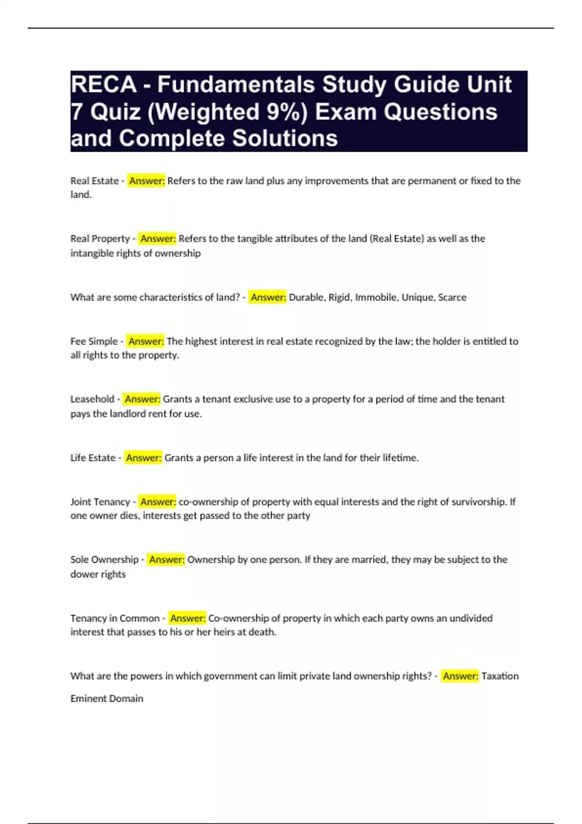 RECA - Fundamentals Study Guide Unit 7 Quiz (Weighted 9%) Exam Questions and Complete Solutions
