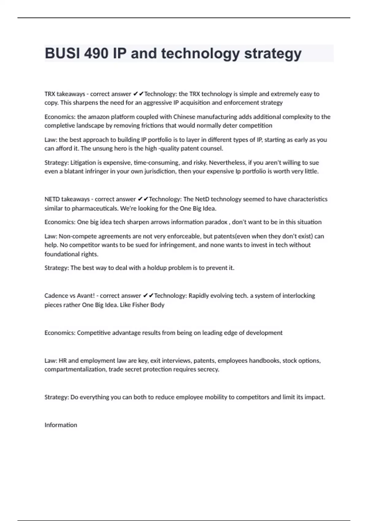 BUSI 490 IP and technology strategyTRX takeaways - correct answer Technology: the TRX technology is simple and extremely easy to copy. This sharpens the need for an aggressive IP acquisition and enforcement strategy Economics: the amazon platform coupled with Chinese manufacturing adds additional complexity to the completive landscape by removing frictions that would normally deter competition Law: the best approach to building IP portfolio is to layer in different types of IP, starting as early as you can afford it. The unsung hero is the high -quality patent counsel. Strategy: Litigation is expensive, time-consuming, and risky. Nevertheless, if you aren't willing to sue even a blatant infringer in your own jurisdiction, then your expensive Ip portfolio is worth very little. NETD takeaways - correct answer Technology: The NetD technology seemed to have characteristics similar to pharmaceuticals. We're looking for the One Big Idea. Economics: One big idea tech sharpen arrows information paradox , don't want to be in this situation Law: Non-compete agreements are not very enforceable, but patents(even when they don't exist) can help. No competitor wants to be sued for infringement, and none wants to invest in tech without foundational rights. Strategy: The best way to deal with a holdup problem is to prevent it. Cadence vs Avant! - correct answer Technology: Rapidly evolving tech. a system of interlocking pieces rather One Big Idea. Like Fisher Body Economics: Competitive advantage results from being on leading edge of development Law: HR and employment law are key, exit interviews, patents, employees handbooks, stock options, compartmentalization, trade secret protection requires secrecy. Strategy: Do everything you can both to reduce employee mobility to competitors and limit its impact. Information
