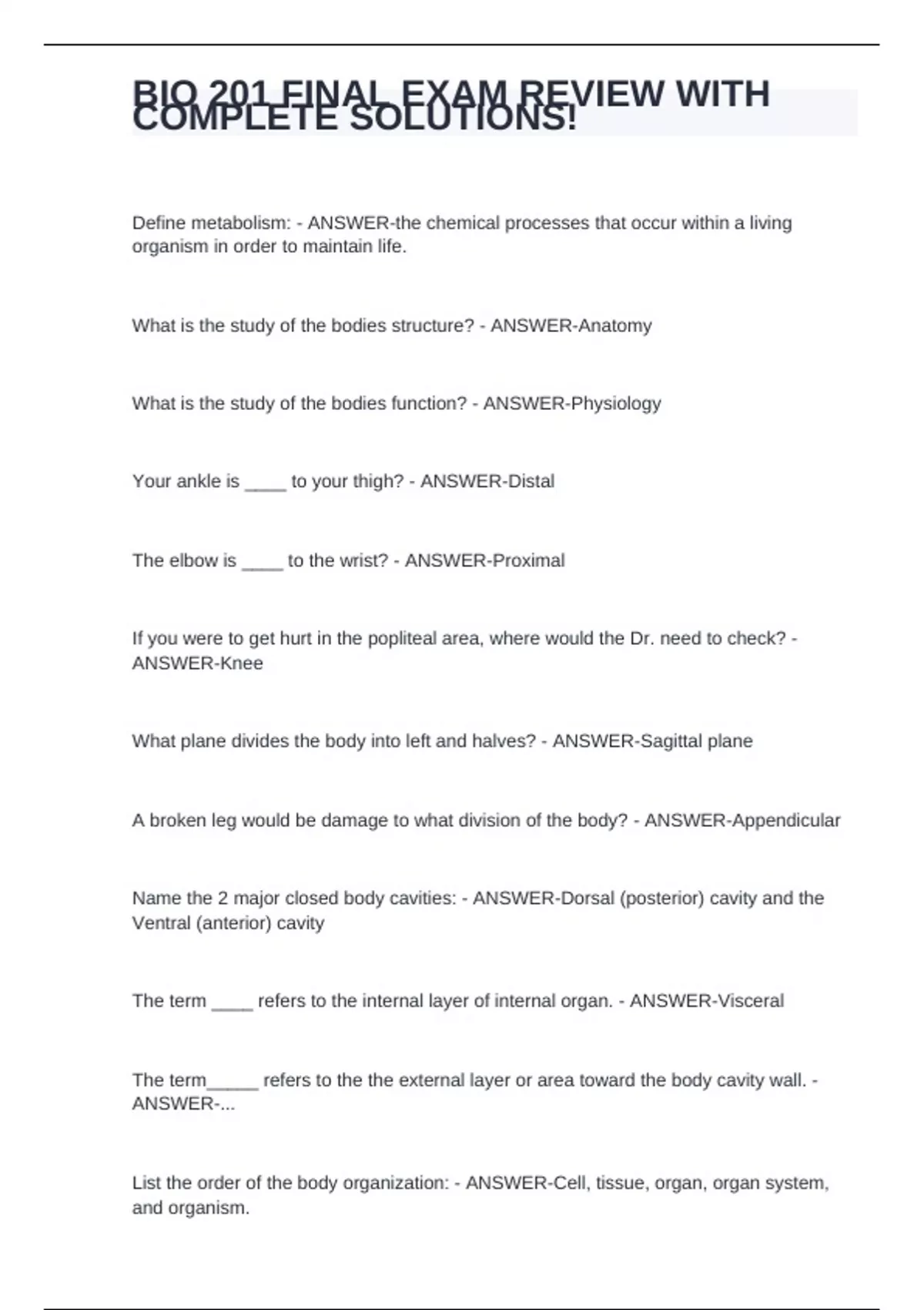 bio 201 final exam review with complete solutions