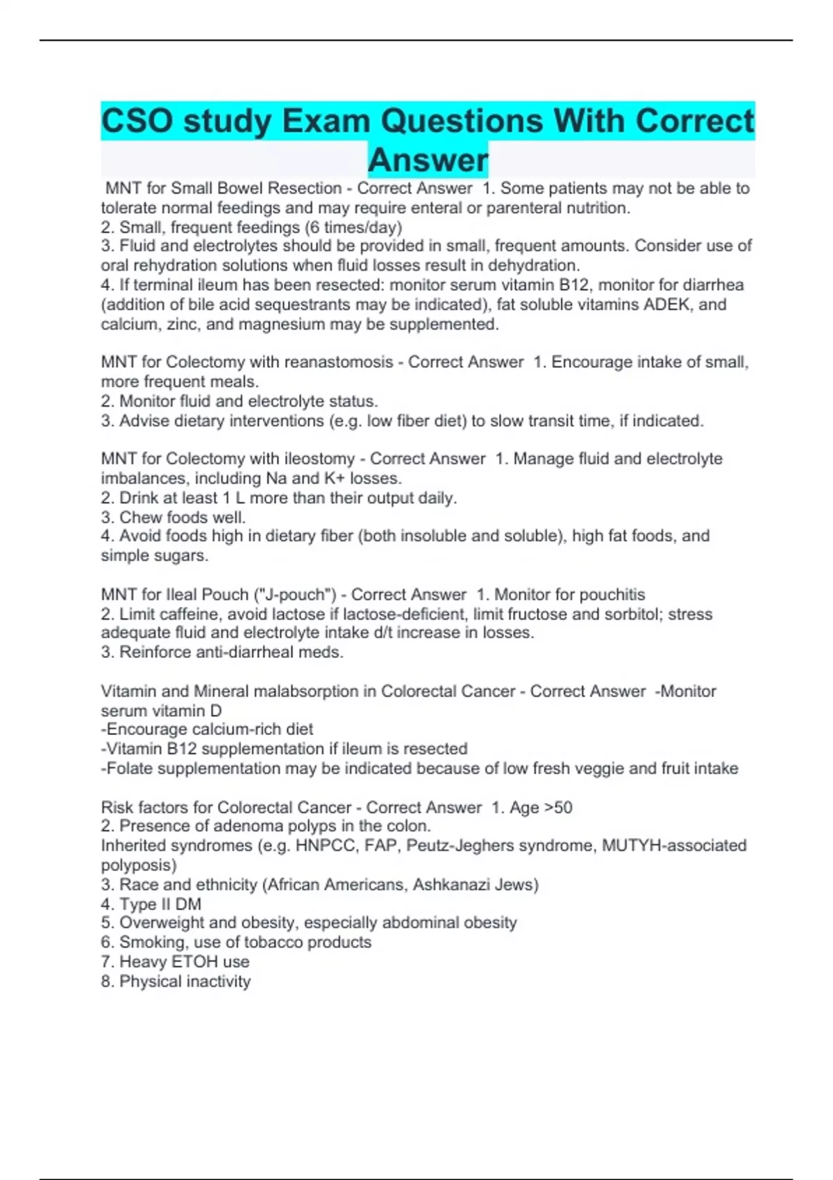 CSO study Exam Questions With Correct Answer MNT for Small Bowel Resection - Correct Answer 1. Some patients may not be able to tolerate normal feedings and may require enteral or parenteral nutrition. 2. Small, frequent feedings (6 times/day) 3. Fluid and electrolytes should be provided in small, frequent amounts. Consider use of oral rehydration solutions when fluid losses result in dehydration. 4. If terminal ileum has been resected: monitor serum vitamin B12, monitor for diarrhea (addition of bile acid sequestrants may be indicated), fat soluble vitamins ADEK, and calcium, zinc, and magnesium may be supplemented. MNT for Colectomy with reanastomosis - Correct Answer 1. Encourage intake of small, more frequent meals. 2. Monitor fluid and electrolyte status. 3. Advise dietary interventions (e.g. low fiber diet) to slow transit time, if indicated. MNT for Colectomy with ileostomy - Correct Answer 1. Manage fluid and electrolyte imbalances, including Na and K+ losses. 2. Drink at least 1 L more than their output daily. 3. Chew foods well. 4. Avoid foods high in dietary fiber (both insoluble and soluble), high fat foods, and simple sugars. MNT for Ileal Pouch ("J-pouch") - Correct Answer 1. Monitor for pouchitis 2. Limit caffeine, avoid lactose if lactose-deficient, limit fructose and sorbitol; stress adequate fluid and electrolyte intake d/t increase in losses. 3. Reinforce anti-diarrheal meds. Vitamin and Mineral malabsorption in Colorectal Cancer - Correct Answer -Monitor serum vitamin D -Encourage calcium-rich diet -Vitamin B12 supplementation if ileum is resected -Folate supplementation may be indicated because of low fresh veggie and fruit intake Risk factors for Colorectal Cancer - Correct Answer 1. Age 50 2. Presence of adenoma polyps in the colon. Inherited syndromes (e.g. HNPCC, FAP, Peutz-Jeghers syndrome, MUTYH-associated polyposis) 3. Race and ethnicity (African Americans, Ashkanazi Jews) 4. Type II DM 5. Overweight and obesity, especially abdominal obesity 6. Smoking, use of tobacco products 7. Heavy ETOH use 8. Physical inactivity