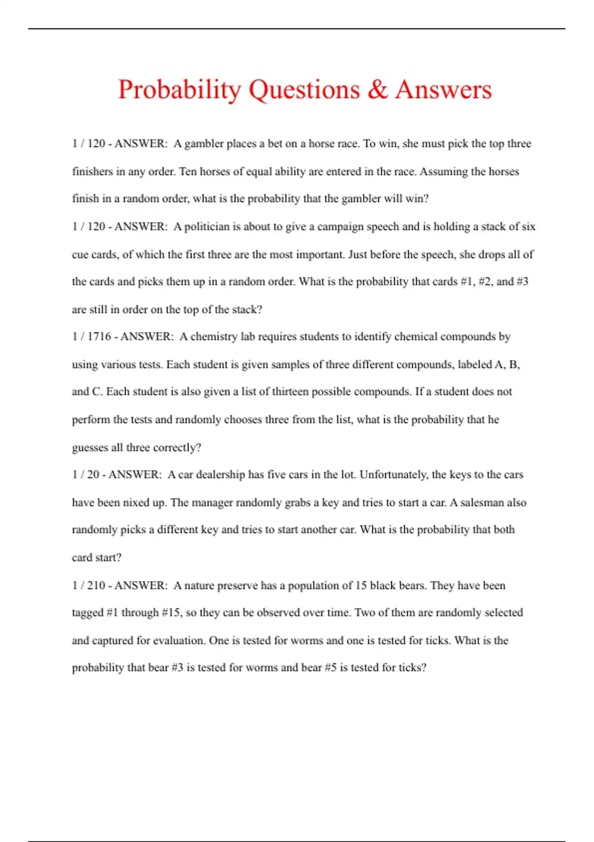 Probability Questions & Answers 1 / 120 - ANSWER: A gambler places a bet on a horse race. To win, she must pick the top three finishers in any order. Ten horses of equal ability are entered in the race. Assuming the horses finish in a random order, what is the probability that the gambler will win? 1 / 120 - ANSWER: A politician is about to give a campaign speech and is holding a stack of six cue cards, of which the first three are the most important. Just before the speech, she drops all of the cards and picks them up in a random order. What is the probability that cards #1, #2, and #3 are still in order on the top of the stack? 1 / 1716 - ANSWER: A chemistry lab requires students to identify chemical compounds by using various tests. Each student is given samples of three different compounds, labeled A, B, and C. Each student is also given a list of thirteen possible compounds. If a student does not perform the tests and randomly chooses three from the list, what is the probability that he guesses all three correctly? 1 / 20 - ANSWER: A car dealership has five cars in the lot. Unfortunately, the keys to the cars have been nixed up. The manager randomly grabs a key and tries to start a car. A salesman also randomly picks a different key and tries to start another car. What is the probability that both card start?.................................