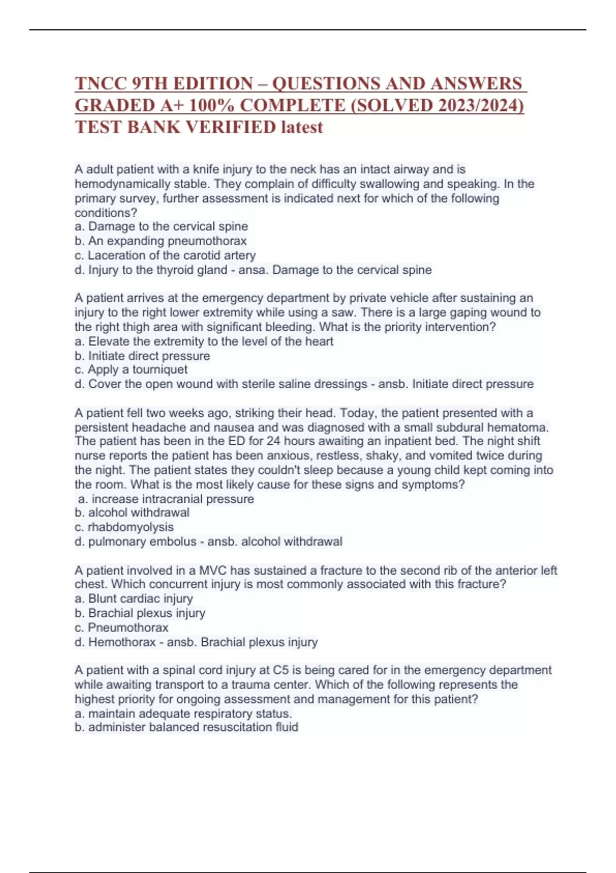 , TNCC 9TH EDITION – QUESTIONS AND ANSWERS