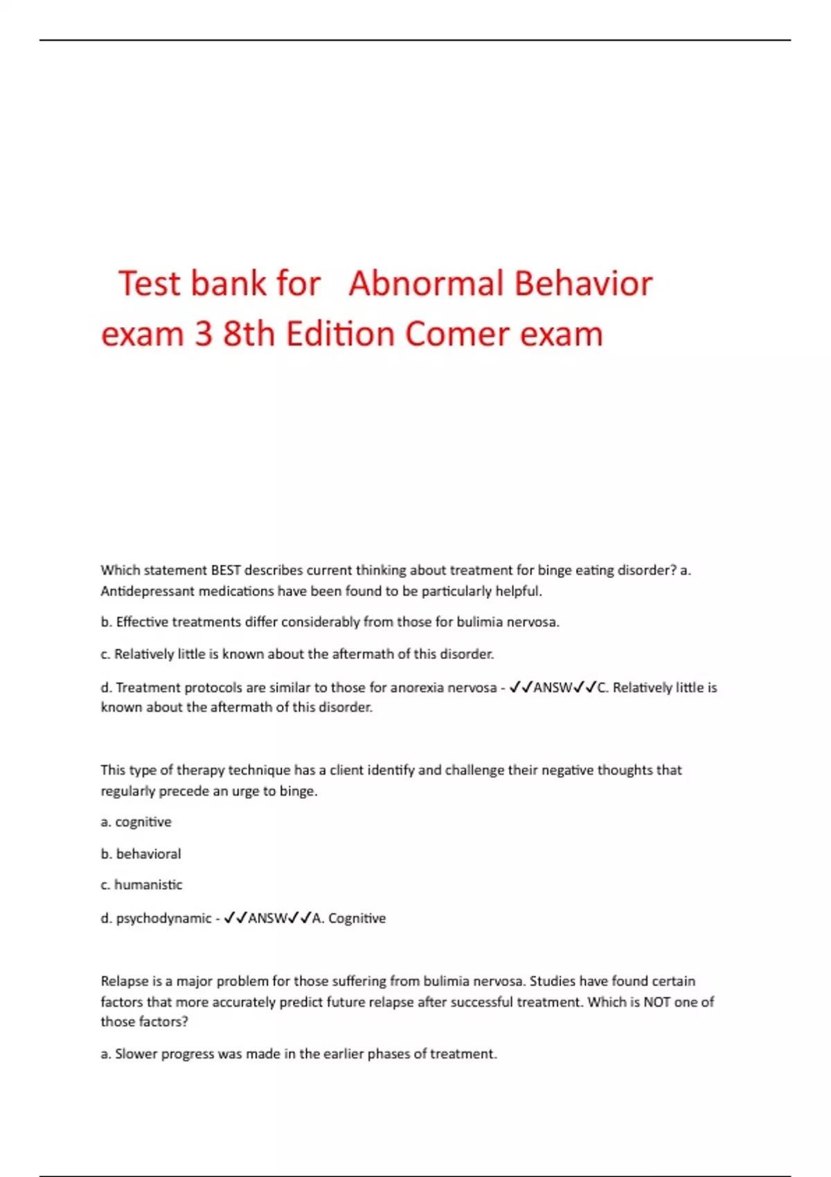 Test bank for Abnormal Behavior exam 3 8th Edition Comer exam