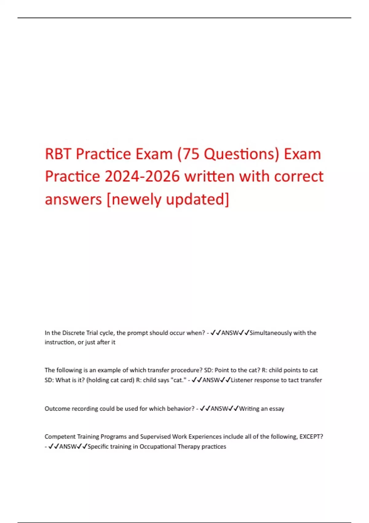 RBT Practice Exam (75 Questions) Exam Practice written with correct answers [newely updated]