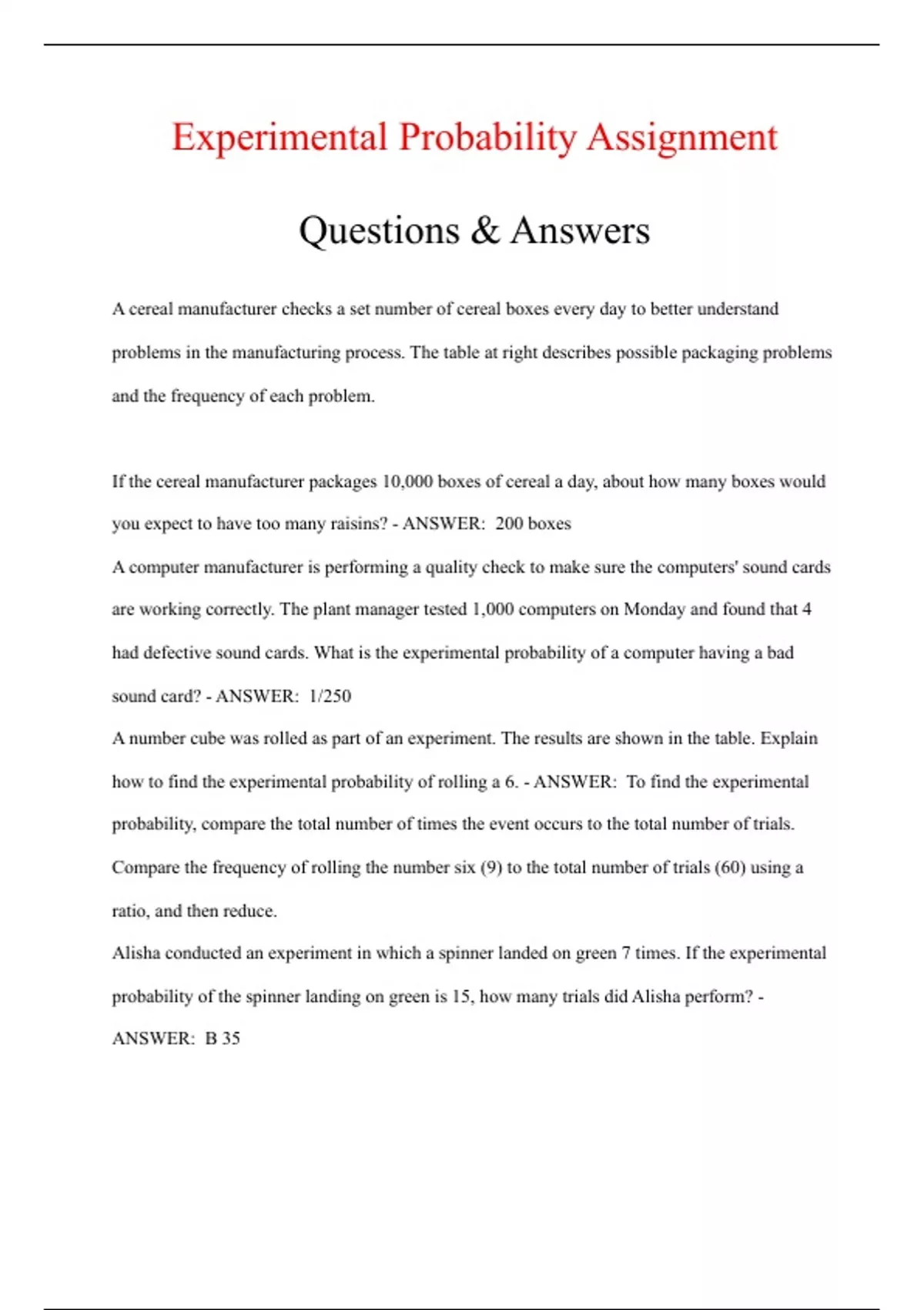 Experimental Probability Assignment Questions & Answers A cereal manufacturer checks a set number of cereal boxes every day to better understand problems in the manufacturing process. The table at right describes possible packaging problems and the frequency of each problem. If the cereal manufacturer packages 10,000 boxes of cereal a day, about how many boxes would you expect to have too many raisins? - ANSWER: 200 boxes A computer manufacturer is performing a quality check to make sure the computers' sound cards are working correctly. The plant manager tested 1,000 computers on Monday and found that 4 had defective sound cards. What is the experimental probability of a computer having a bad sound card? - ANSWER: 1/250 A number cube was rolled as part of an experiment. The results are shown in the table. Explain how to find the experimental probability of rolling a 6. - ANSWER: To find the experimental probability, compare the total number of times the event occurs to the total number of trials. Compare the frequency of rolling the number six (9) to the total number of trials (60) using a ratio, and then reduce.