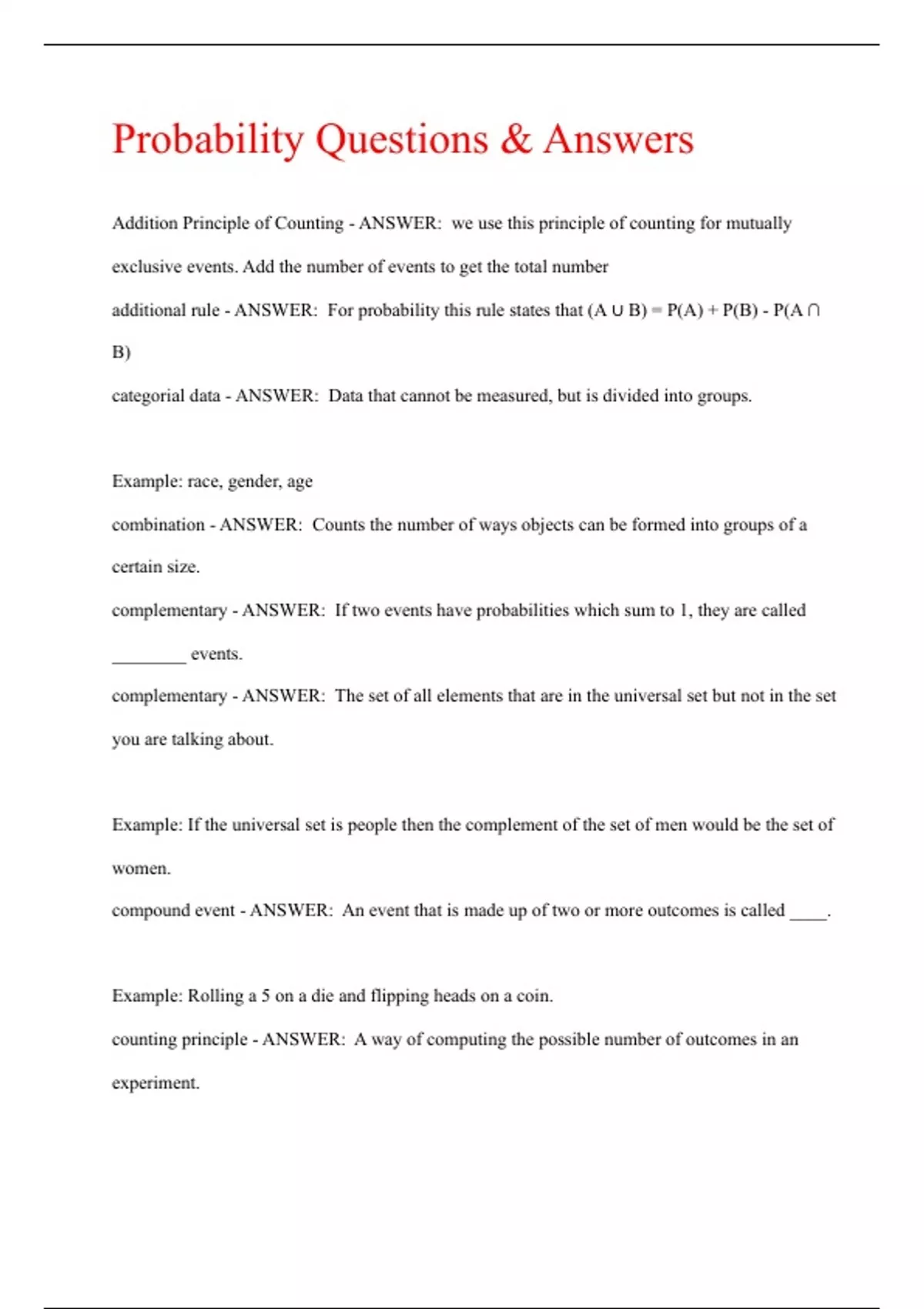 Probability Questions & Answers Addition Principle of Counting - ANSWER: we use this principle of counting for mutually exclusive events. Add the number of events to get the total number additional rule - ANSWER: For probability this rule states that (A ∪ B) = P(A) + P(B) - P(A ∩ B) categorial data - ANSWER: Data that cannot be measured, but is divided into groups. Example: race, gender, age combination - ANSWER: Counts the number of ways objects can be formed into groups of a certain size. complementary - ANSWER: If two events have probabilities which sum to 1, they are called ________ events. complementary - ANSWER: The set of all elements that are in the universal set but not in the set you are talking about. Example: If the universal set is people then the complement of the set of men would be the set of women. compound event - ANSWER: An event that is made up of two or more outcomes is called ____. Example: Rolling a 5 on a die and flipping heads on a coin. counting principle - ANSWER: A way of computing the possible number of outcomes in an experiment...