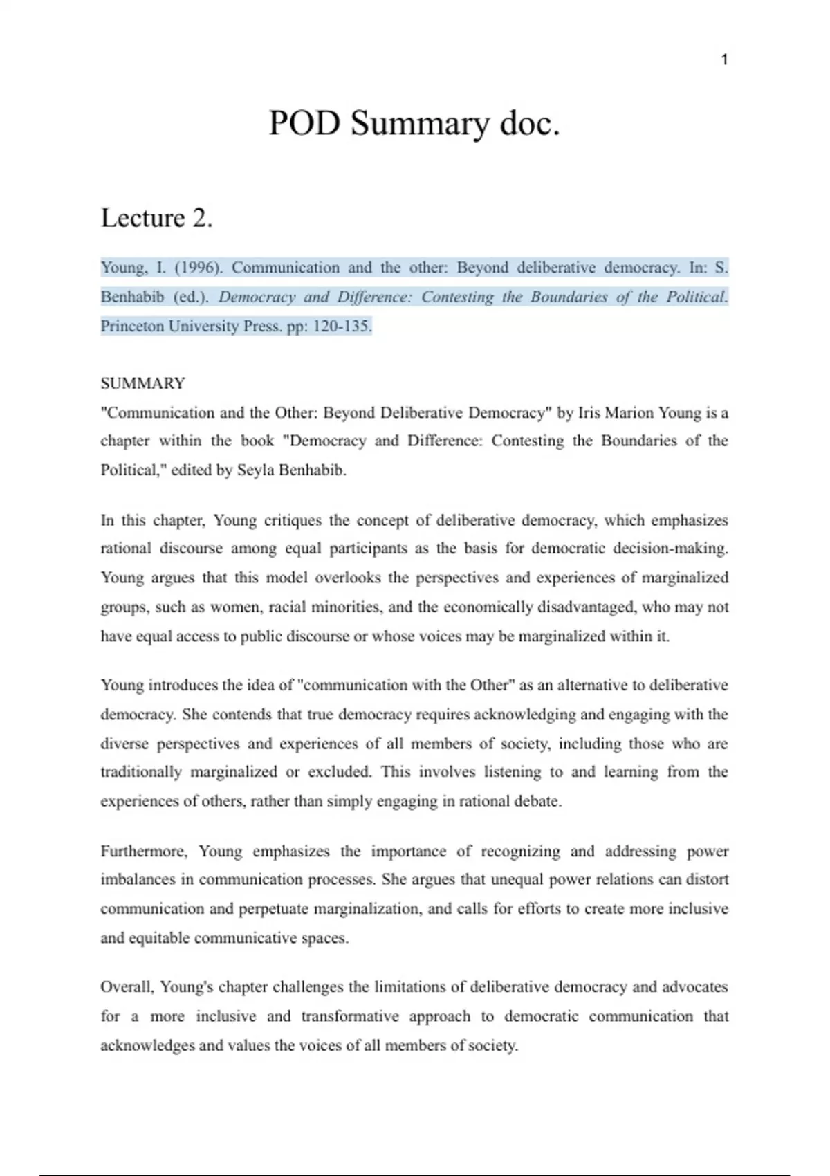 This document has in-depth summaries of all the readings of POD. Each reading has a summary and list of the key points of the artciles/ literature. It really helped me with my exams but also the persusals!!!