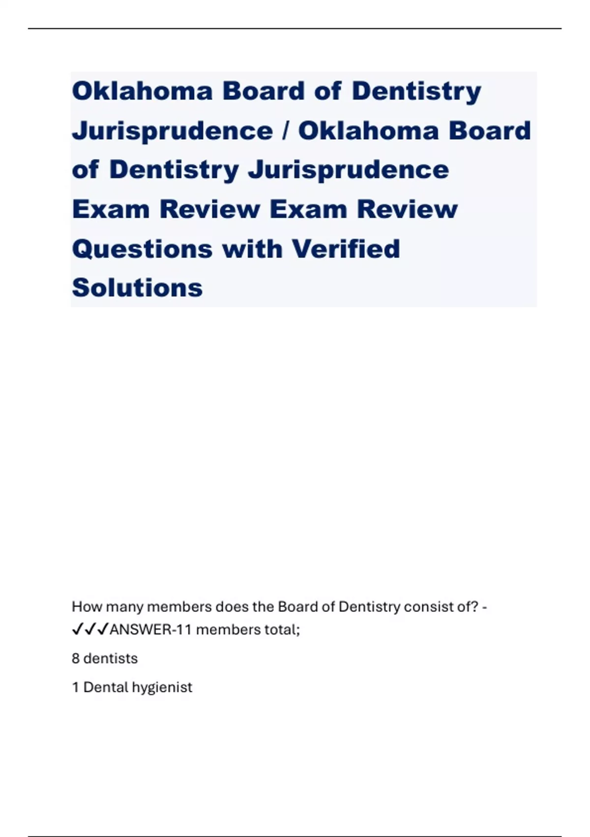Oklahoma Board of Dentistry Jurisprudence / Oklahoma Board of Dentistry Jurisprudence Exam Review Exam Review Questions with Verified Solutions How many members does the Board of Dentistry consist of? - ANSWER-11 members total; 8 dentists 1 Dental hygienist