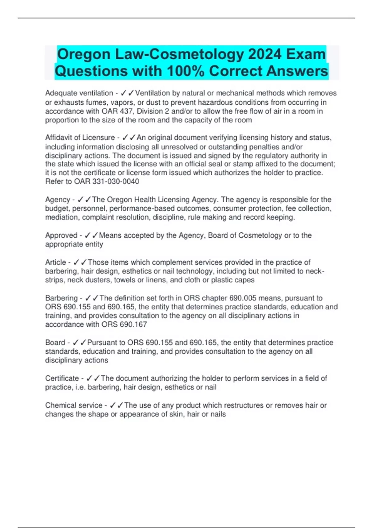 Oregon Law-Cosmetology 2024 Exam Questions with 100% Correct Answers Adequate ventilation - Ventilation by natural or mechanical methods which removes or exhausts fumes, vapors, or dust to prevent hazardous conditions from occurring in accordance with OAR 437, Division 2 and/or to allow the free flow of air in a room in proportion to the size of the room and the capacity of the room Affidavit of Licensure - An original document verifying licensing history and status, including information disclosing all unresolved or outstanding penalties and/or disciplinary actions. The document is issued and signed by the regulatory authority in the state which issued the license with an official seal or stamp affixed to the document; it is not the certificate or license form issued which authorizes the holder to practice. Refer to OAR Agency - The Oregon Health Licensing Agency. The agency is responsible for the budget, personnel, performance-based outcomes, consumer protection, fee collection, mediation, complaint resolution, discipline, rule making and record keeping. Approved - Means accepted by the Agency, Board of Cosmetology or to the appropriate entity Article - Those items which complement services provided in the practice of barbering, hair design, esthetics or nail technology, including but not limited to neck strips, neck dusters, towels or linens, and cloth or plastic capes Barbering - The definition set forth in ORS chapter 690.005 means, pursuant to ORS 690.155 and 690.165, the entity that determines practice standards, education and training, and provides consultation to the agency on all disciplinary actions in accordance with ORS 690.167 Board - Pursuant to ORS 690.155 and 690.165, the entity that determines practice standards, education and training, and provides consultation to the agency on all disciplinary actions Certificate - The document authorizing the holder to perform services in a field of practice, i.e. barbering, hair design, esthetics or nail Chemical service - The use of any product which restructures or removes hair or changes the shape or appearance of skin, hair or nails