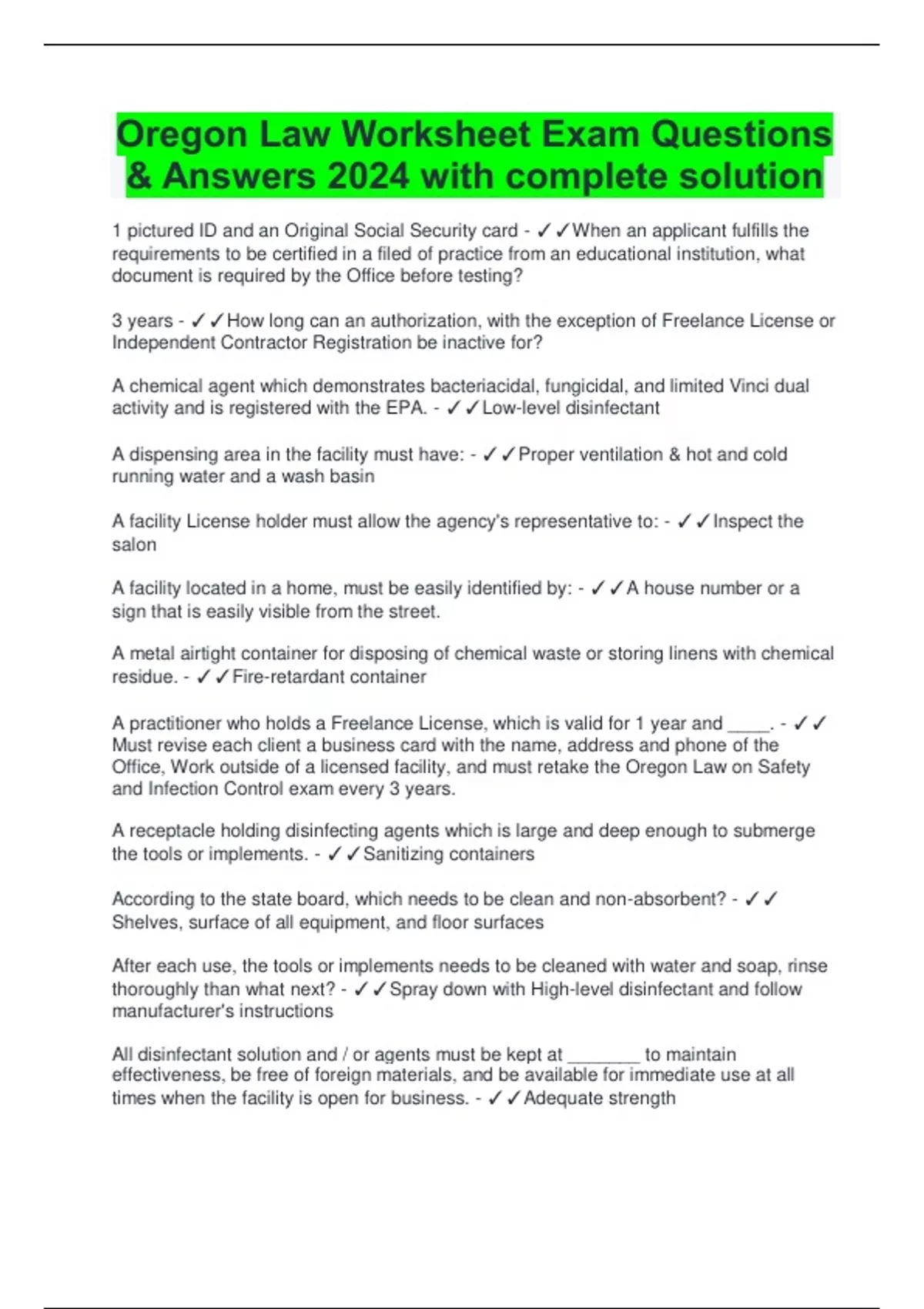 Oregon Law Worksheet Exam Questions & Answers 2024 with complete solution