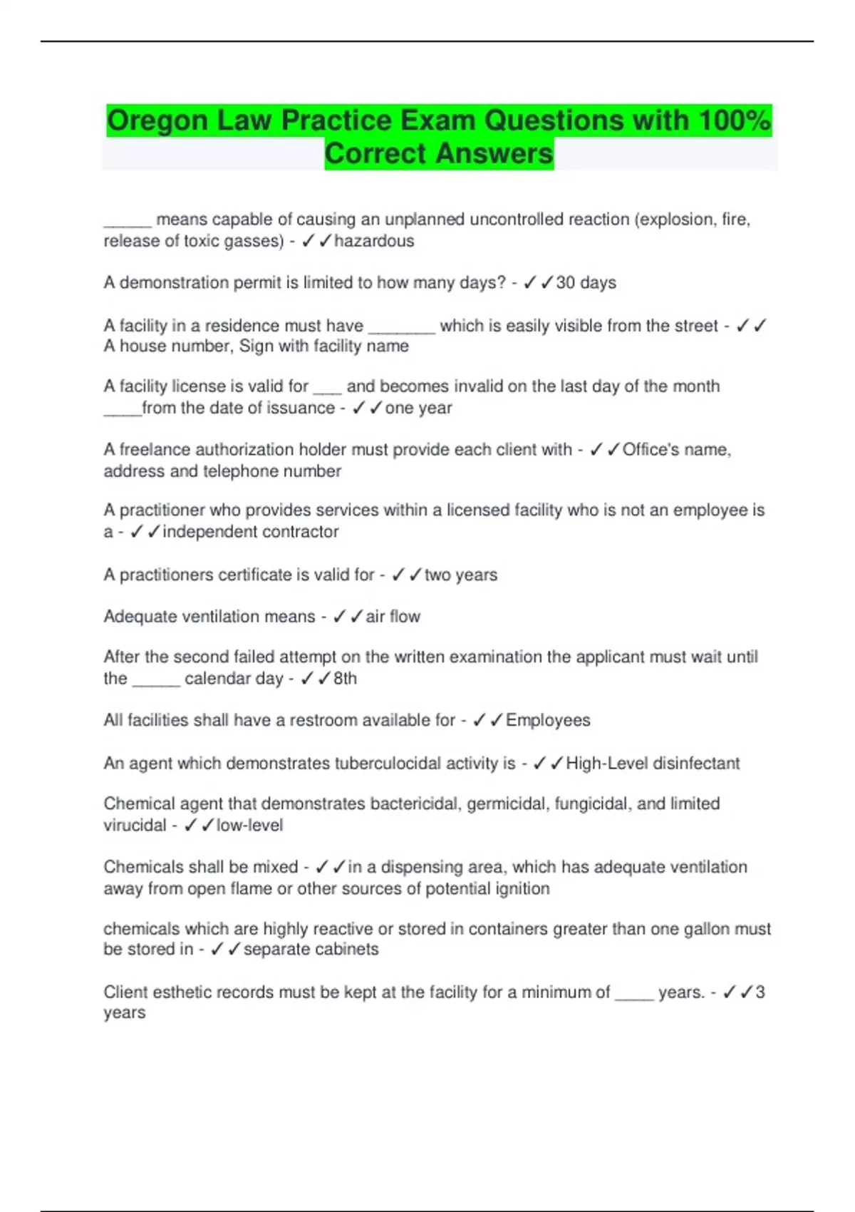 Oregon Law Practice Exam Questions with 100% Correct Answers _____ means capable of causing an unplanned uncontrolled reaction (explosion, fire, release of toxic gasses) - hazardous A demonstration permit is limited to how many days? - 30 days A facility in a residence must have _______ which is easily visible from the street - A house number, Sign with facility name A facility license is valid for ___ and becomes invalid on the last day of the month ____from the date of issuance - one year A freelance authorization holder must provide each client with - Office's name, address and telephone number A practitioner who provides services within a licensed facility who is not an employee is a - independent contractor A practitioners certificate is valid for - two years Adequate ventilation means - air flow