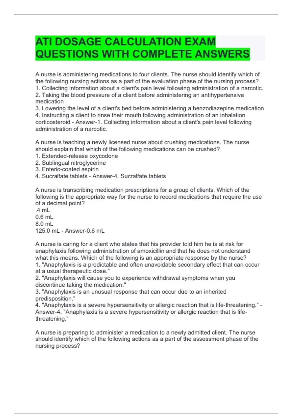 ATI DOSAGE CALCULATION EXAM QUESTIONS WITH COMPLETE ANSWERS