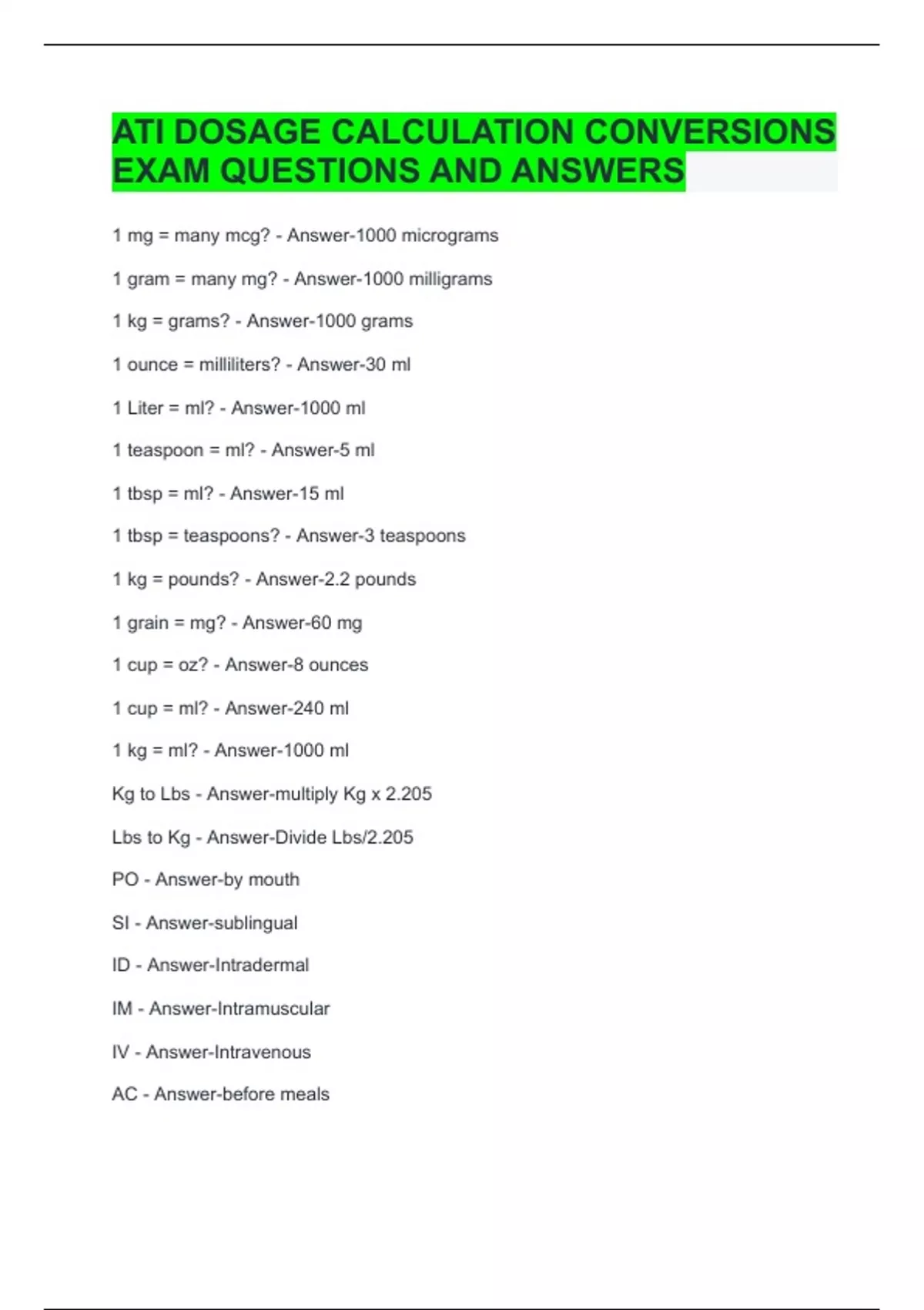 ATI DOSAGE CALCULATION CONVERSIONS EXAM QUESTIONS AND ANSWERS