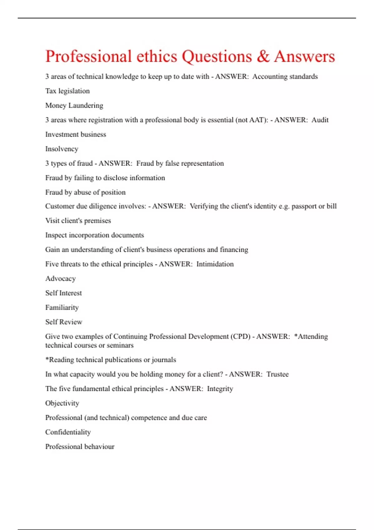 Professionalism Ethics Questions & Answers Accuracy of information - ANSWER: this issue is of specific importance in cases where an information where an information professional is working with personal information that can have a direct influence on the life of a person. Client and employer - ANSWER: Principles where software engineers shall provide service in their areas of competence, being honest and forthright about any limitations of their experience and education. Colleagues - ANSWER: Principles where software engineers shall be fair and assist co-workers in being fully aware of current standard work practices including policies and procedures for protecting passwords, files and other confidential information and security measures in general. Computer Ethics - ANSWER: Deals with the procedures values and practices that govern the process of consuming computing technology and its related disciplines without damaging or violating the moral values and beliefs of any individual, organization or entity. Confidential treatment - ANSWER: this issue refers specifically to information gained from the reference interview. Constitutional Right to Privacy - ANSWER: protects the liberty of people to make certain crucial decisions regarding their well-being without government coercion, intimidation or interference. Due process of law - ANSWER: "We mean" a law which hears before it condemns; which proceeds upon inquiry, and renders judgement only after trial. Economical and Social level - ANSWER: the biggest effect is the growth of large information businesses like credit bureau and telecommunication companies that specialize in the processing and trade of person-related information. Ethical Decision Making High Standards of Practice and Ethical Behavior Trust and Respect from the General Public Evaluation Benchmark - ANSWER: Benefits of professional code of ethics of individual. Ethical decision making - ANSWER: adherence to professional code of ethics means that practitioners use a common set of core values and beliefs