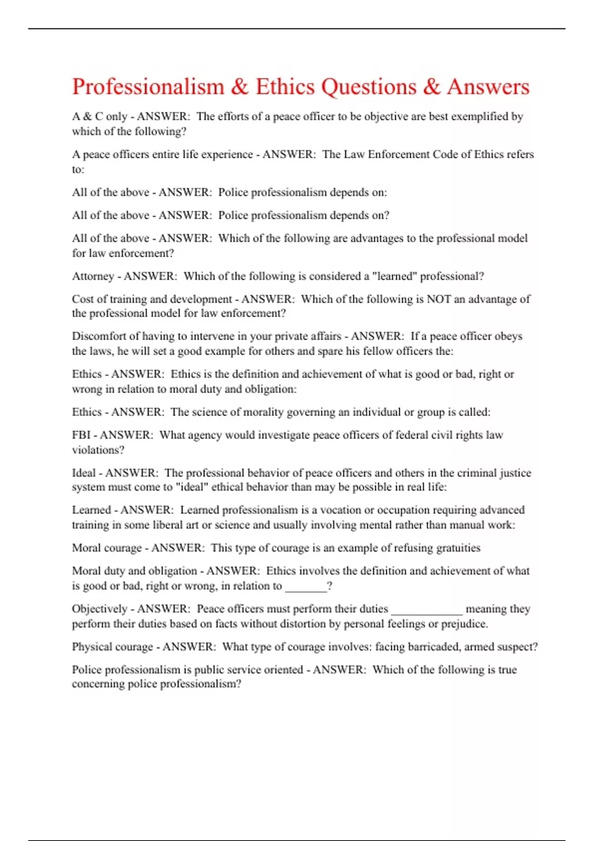 Professionalism & Ethics Questions & Answers ____________ ____________ on the part of peace officers can result in federal prosecution. - ANSWER: Unethical conduct _______________ _______________, like procedural justice, should permeate the agency at all levels. - ANSWER: Community policing All people want to be _______________. - ANSWER: heard Americans have a strong sense of _______________. - ANSWER: fairness Analysis - ANSWER: Researching what is known about a problem Aware - ANSWER: Self analysis goes on and we eventually become aware of some of the damage that our defiance and resignation have caused to our own lives and other people care about. First step to developing a more positive outlook on life. Commitment - ANSWER: This is the final result of the positive life changes we made. We don't expect perfection of ourselves or others, but are committed to attempt our best ideals, with our best abilities, while remaining realistic about our talents and results. Courage - ANSWER: The state or quality of mind or spirit that enables one to face danger with self-possession, confidence and resolution; bravery, valor. Decisive - ANSWER: Consciously doing something different and positive, taking responsibility for our own lives and our happiness. Defiant - ANSWER: Fear and indecision are overcome as we realize that we take some responsibility in our own hands. Actions taken at this stage are usually negative and destructive, especially when covert or hidden. Define the term "Degradation of Legitimacy" - ANSWER: Behavior that ignores the basic goals of the criminal justice system and which only serves individual or agency-oriented motives tends to confuse people, causes them to lose confidence in the system, and runs counter to the reason that the system exists.
