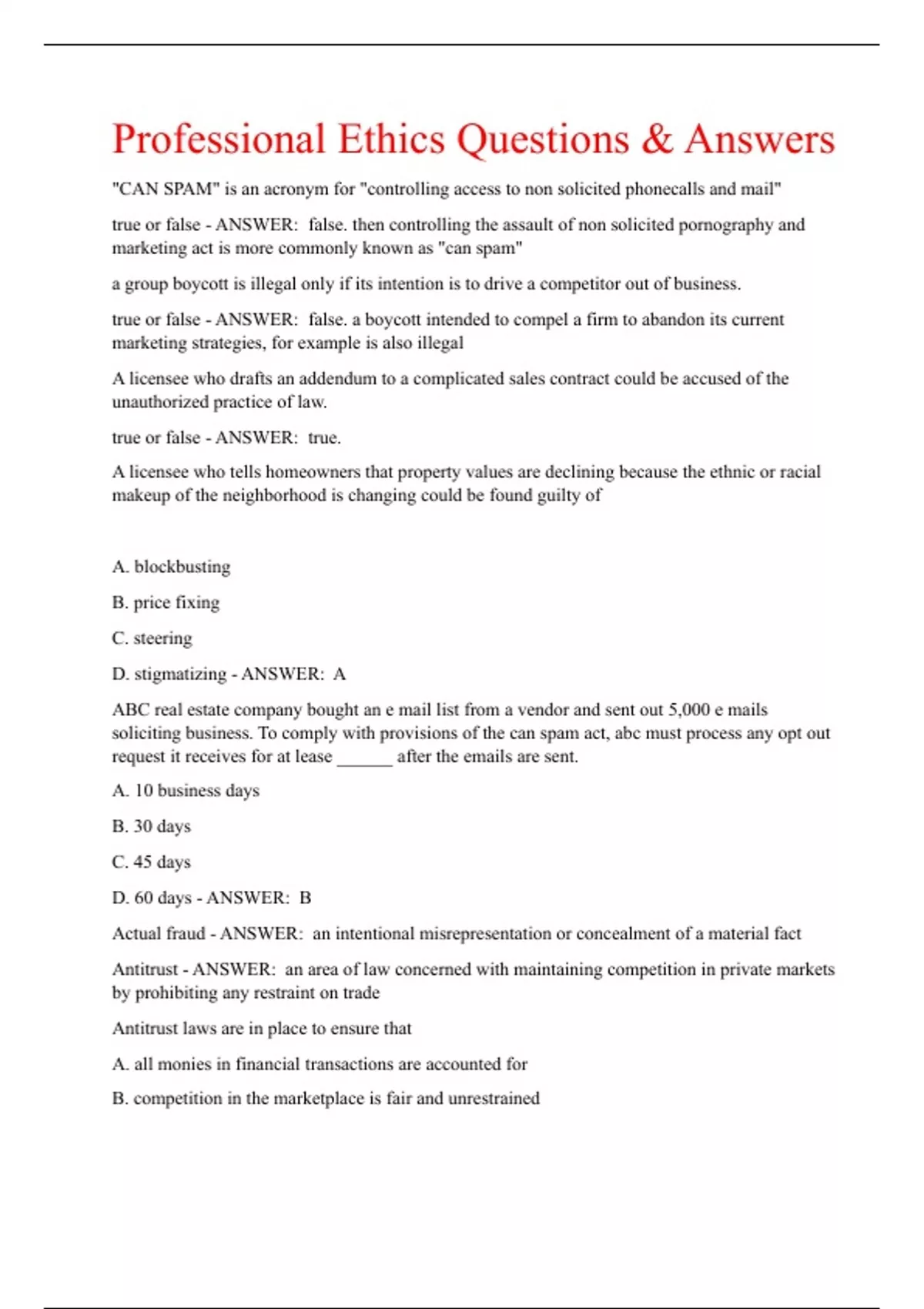 Professional Ethics Questions & Answers "CAN SPAM" is an acronym for "controlling access to non solicited phonecalls and mail" true or false - ANSWER: false. then controlling the assault of non solicited pornography and marketing act is more commonly known as "can spam" a group boycott is illegal only if its intention is to drive a competitor out of business. true or false - ANSWER: false. a boycott intended to compel a firm to abandon its current marketing strategies, for example is also illegal A licensee who drafts an addendum to a complicated sales contract could be accused of the unauthorized practice of law. true or false - ANSWER: true. A licensee who tells homeowners that property values are declining because the ethnic or racial makeup of the neighborhood is changing could be found guilty of A. blockbusting B. price fixing C. steering D. stigmatizing - ANSWER: A ABC real estate company bought an e mail list from a vendor and sent out 5,000 e mails soliciting business. To comply with provisions of the can spam act, abc must process any opt out request it receives for at lease ______ after the emails are sent. A. 10 business days B. 30 days C. 45 days D. 60 days - ANSWER: B Actual fraud - ANSWER: an intentional misrepresentation or concealment of a material fact Antitrust - ANSWER: an area of law concerned with maintaining competition in private markets by prohibiting any restraint on trade Antitrust laws are in place to ensure that A. all monies in financial transactions are accounted for B. competition in the marketplace is fair and unrestrained..