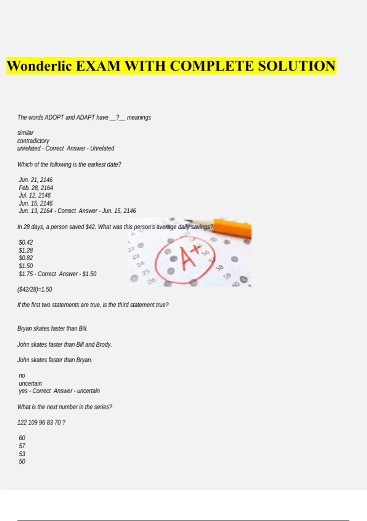 Wonderlic EXAM WITH COMPLETE SOLUTION