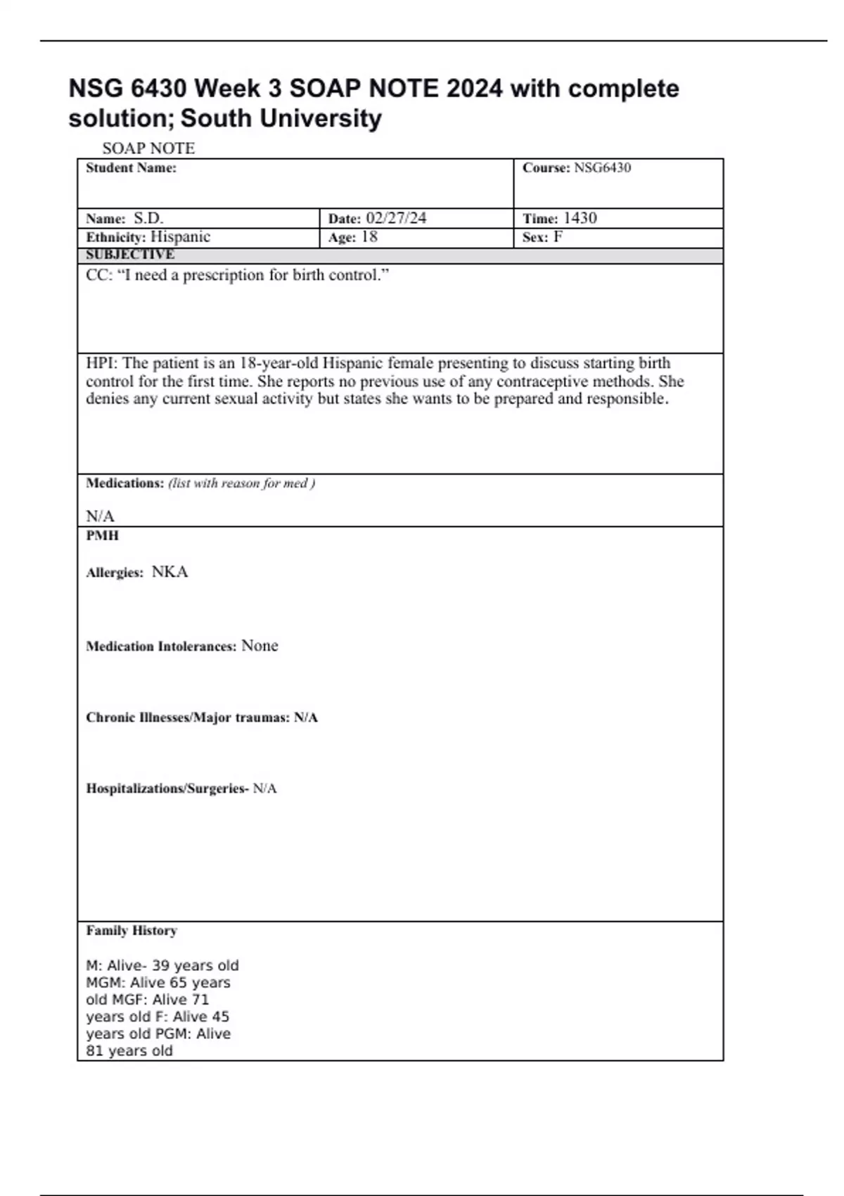 NSG 6430 Week 3 SOAP NOTE 2024 with complete solution; South University HPI: The patient is an 18-year-old Hispanic female presenting to discuss starting birth control for the first time. She reports no previous use of any contraceptive methods. She denies any current sexual activity but states she wants to be prepared and responsible