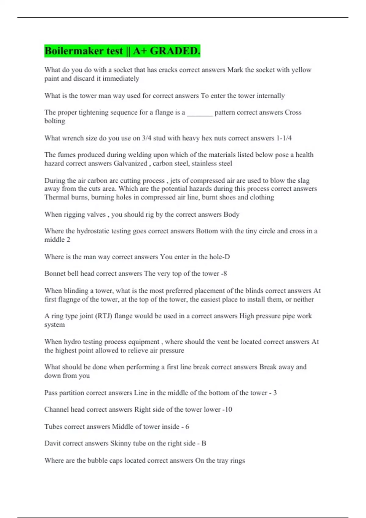 What do you do with a socket that has cracks correct answers Mark the socket with yellow paint and discard it immediately What is the tower man way used for correct answers To enter the tower internally The proper tightening sequence for a flange is a _______ pattern correct answers Cross bolting What wrench size do you use on 3/4 stud with heavy hex nuts correct answers 1-1/4 The fumes produced during welding upon which of the materials listed below pose a health hazard correct answers Galvanized , carbon steel, stainless steel During the air carbon arc cutting process , jets of compressed air are used to blow the slag away from the cuts area. Which are the potential hazards during this process correct answers Thermal burns, burning holes in compressed air line, burnt shoes and clothing When rigging valves , you should rig by the correct answers Body Where the hydrostatic testing goes correct answers Bottom with the tiny circle and cross in a middle 2 Where is the man way correct answers You enter in the hole-D Bonnet bell head correct answers The very top of the tower -8 When blinding a tower, what is the most preferred placement of the blinds correct answers At first flagnge of the tower, at the top of the tower, the easiest place to install them, or neither A ring type joint (RTJ) flange would be used in a correct answers High pressure pipe work system When hydro testing process equipment , where should the vent be located correct answers At the highest point allowed to relieve air pressure What should be done when performing a first line break correct answers Break away and down from you Pass partition correct answers Line in the middle of the bottom of the tower - 3 Channel head correct answers Right side of the tower lower -10 Tubes correct answers Middle of tower inside - 6 Davit correct answers Skinny tube on the right side - B Where are the bubble caps located correct answers On the tray rings