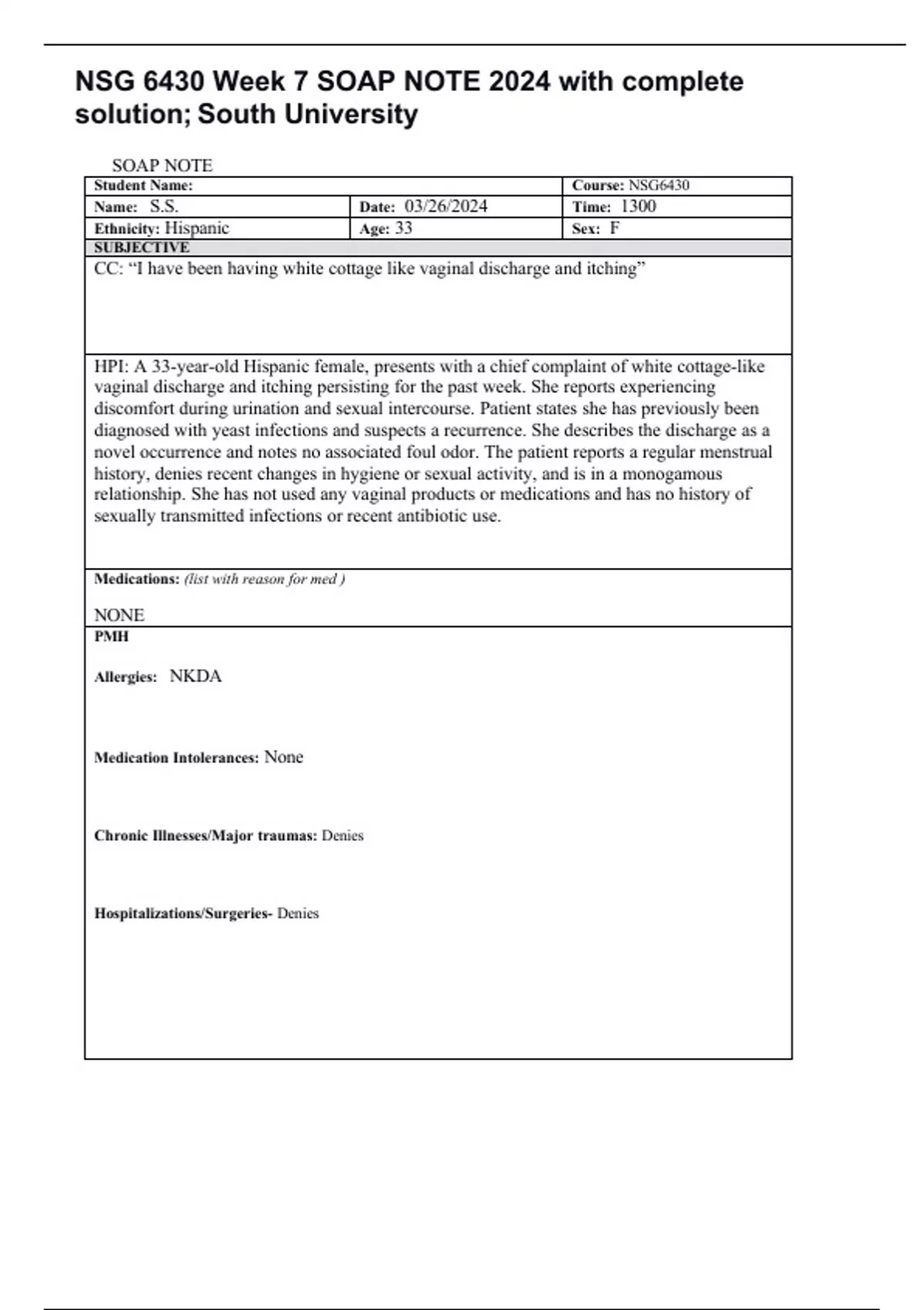 NSG 6430 Week 7 SOAP NOTE 2024 with complete solution; South University CC: “I have been having white cottage like vaginal discharge and itching” HPI: A 33-year-old Hispanic female, presents with a chief complaint of white cottage-like vaginal discharge and itching persisting for the past week. She reports experiencing discomfort during urination and sexual intercourse. Patient states she has previously been diagnosed with yeast infections and suspects a recurrence. She describes the discharge as a novel occurrence and notes no associated foul odor. The patient reports a regular menstrual history, denies recent changes in hygiene or sexual activity, and is in a monogamous relationship. She has not used any vaginal products or medications and has no history of sexually transmitted infections or recent antibiotic use.