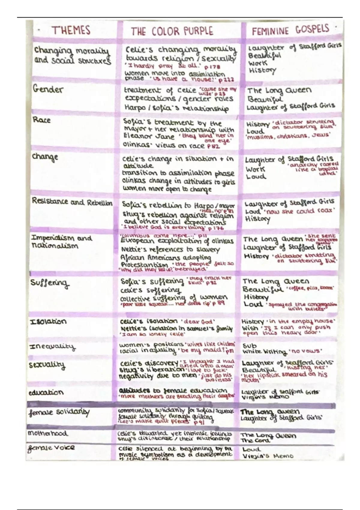 a summary of linking themes between the color purple and feminine gospels with references/ quotes as evidence of each theme