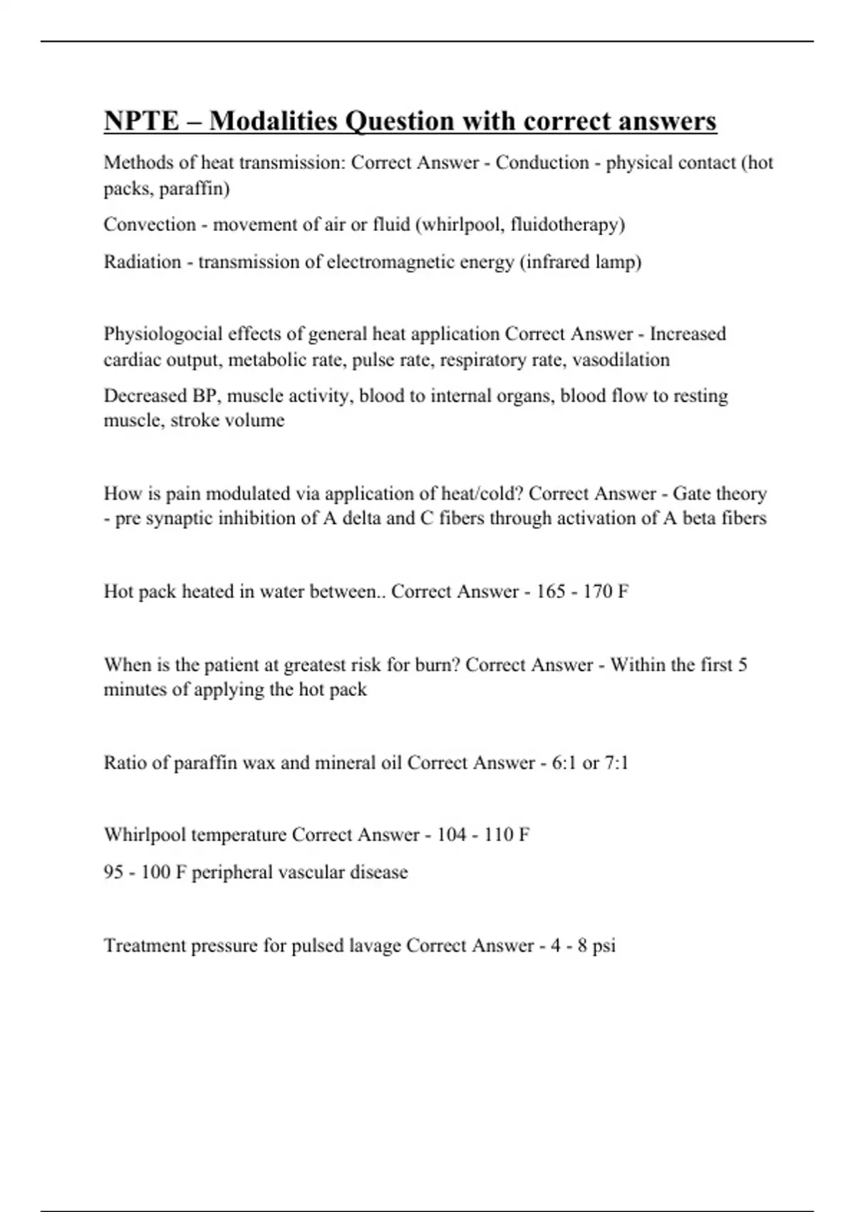 Methods of heat transmission: Correct Answer - Conduction - physical contact (hot packs, paraffin) Convection - movement of air or fluid (whirlpool, fluidotherapy) Radiation - transmission of electromagnetic energy (infrared lamp) Physiologocial effects of general heat application Correct Answer - Increased cardiac output, metabolic rate, pulse rate, respiratory rate, vasodilation Decreased BP, muscle activity, blood to internal organs, blood flow to resting muscle, stroke volume How is pain modulated via application of heat/cold? Correct Answer - Gate theory - pre synaptic inhibition of A delta and C fibers through activation of A beta fibers Hot pack heated in water between.. Correct Answer - 165 - 170 F When is the patient at greatest risk for burn? Correct Answer - Within the first 5 minutes of applying the hot pack Ratio of paraffin wax and mineral oil Correct Answer - 6:1 or 7:1 Whirlpool temperature Correct Answer - 104 - 110 F 95 - 100 F peripheral vascular disease Treatment pressure for pulsed lavage Correct Answer - 4 - 8 psi