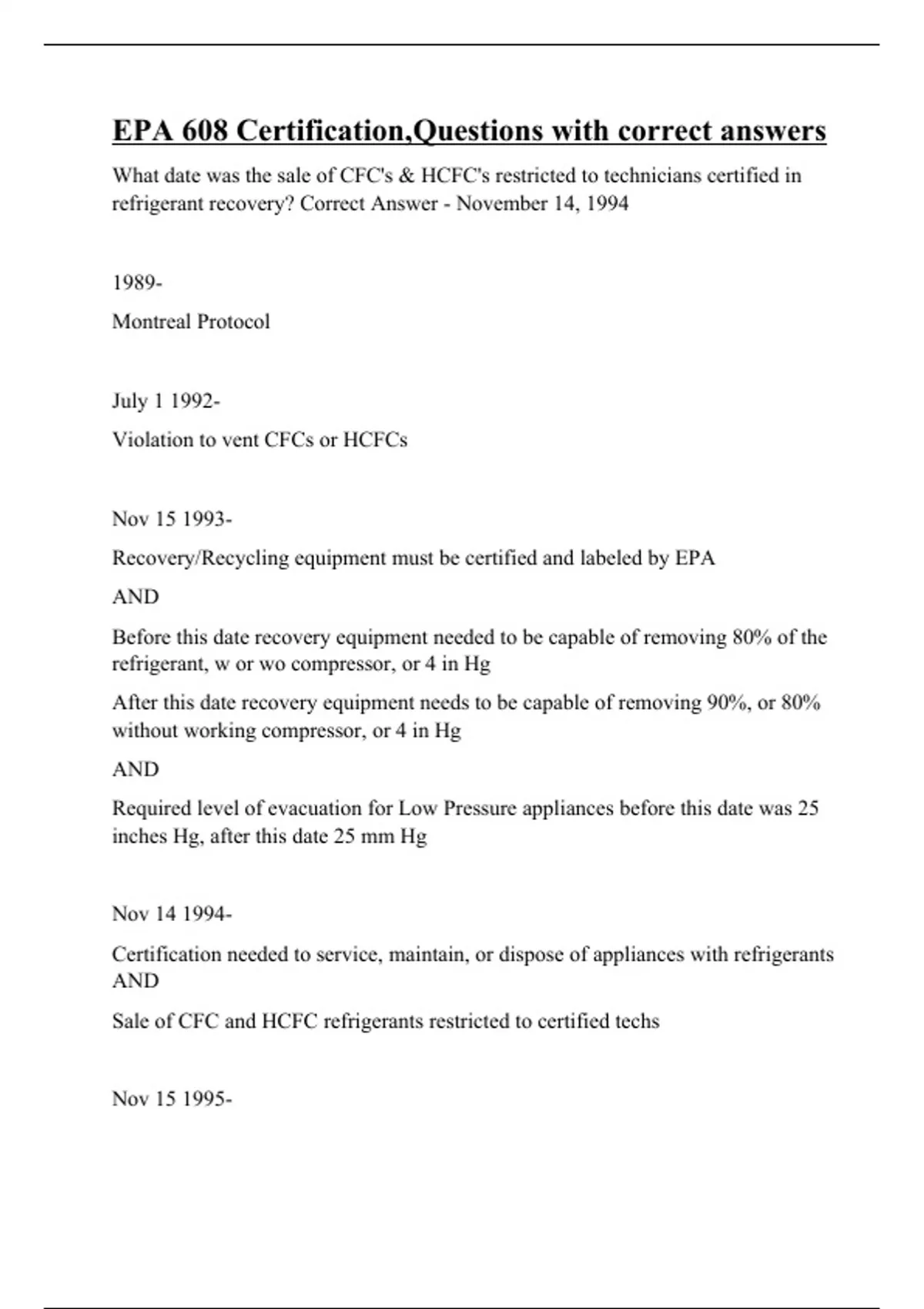What date was the sale of CFC's & HCFC's restricted to technicians certified in refrigerant recovery? Correct Answer - November 14, 1994 1989- Montreal Protocol July 1 1992- Violation to vent CFCs or HCFCs Nov 15 1993- Recovery/Recycling equipment must be certified and labeled by EPA AND Before this date recovery equipment needed to be capable of removing 80% of the refrigerant, w or wo compressor, or 4 in Hg After this date recovery equipment needs to be capable of removing 90%, or 80% without working compressor, or 4 in Hg AND Required level of evacuation for Low Pressure appliances before this date was 25 inches Hg, after this date 25 mm Hg Nov 14 1994- Certification needed to service, maintain, or dispose of appliances with refrigerants AND Sale of CFC and HCFC refrigerants restricted to certified techs Nov 15 1995-