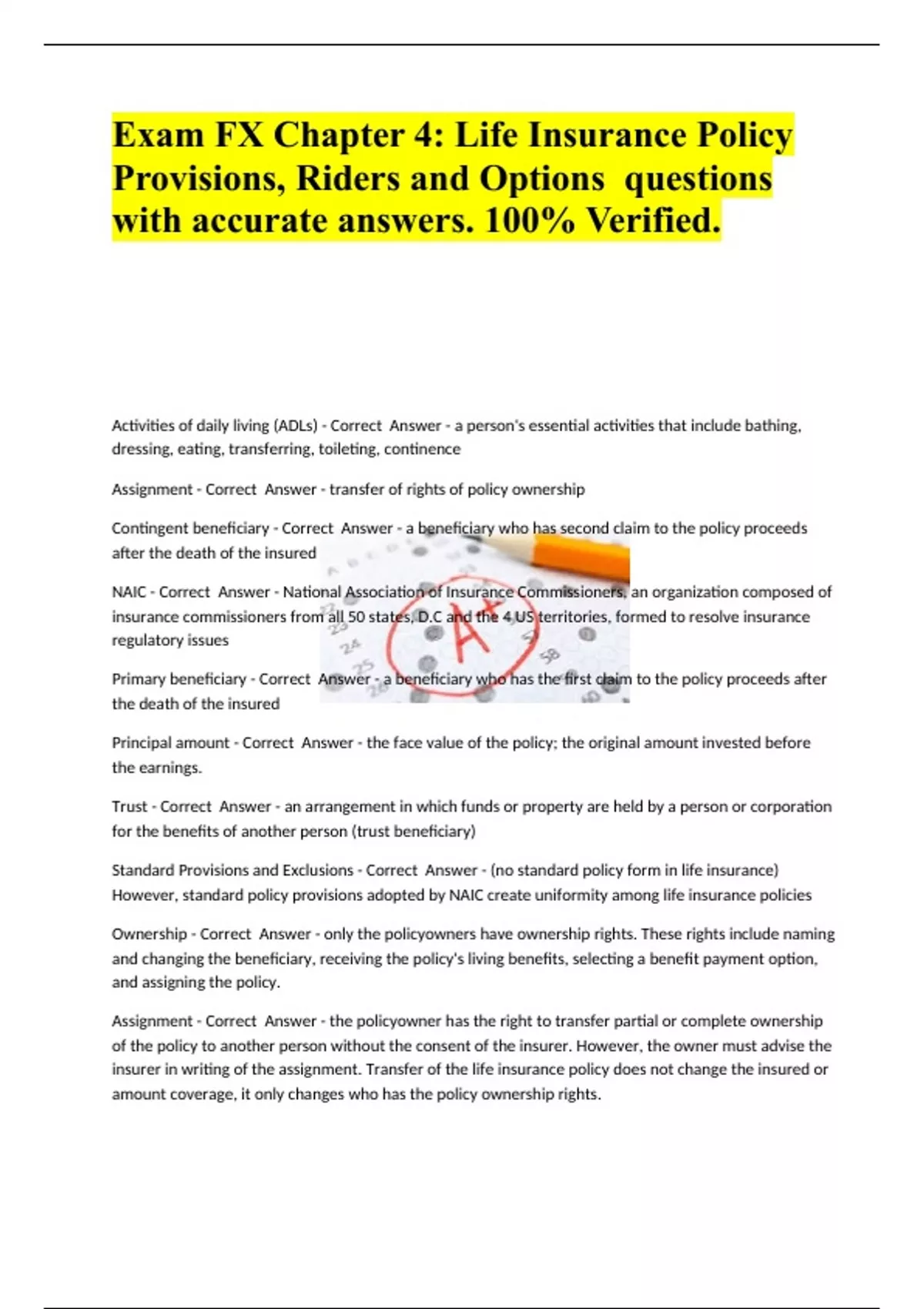 xam FX Chapter 4 Life Insurance Policy Provisions, Riders and Options questions with accurate answers.