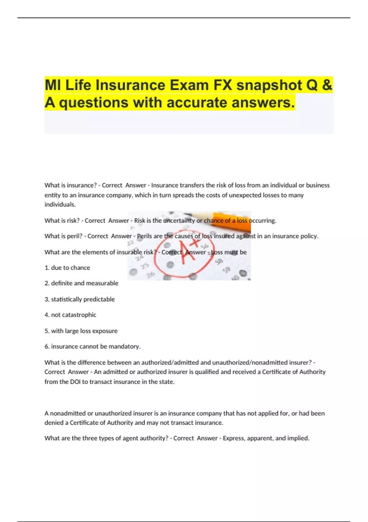 MI Life Insurance Exam FX snapshot Q & A questions with accurate answers