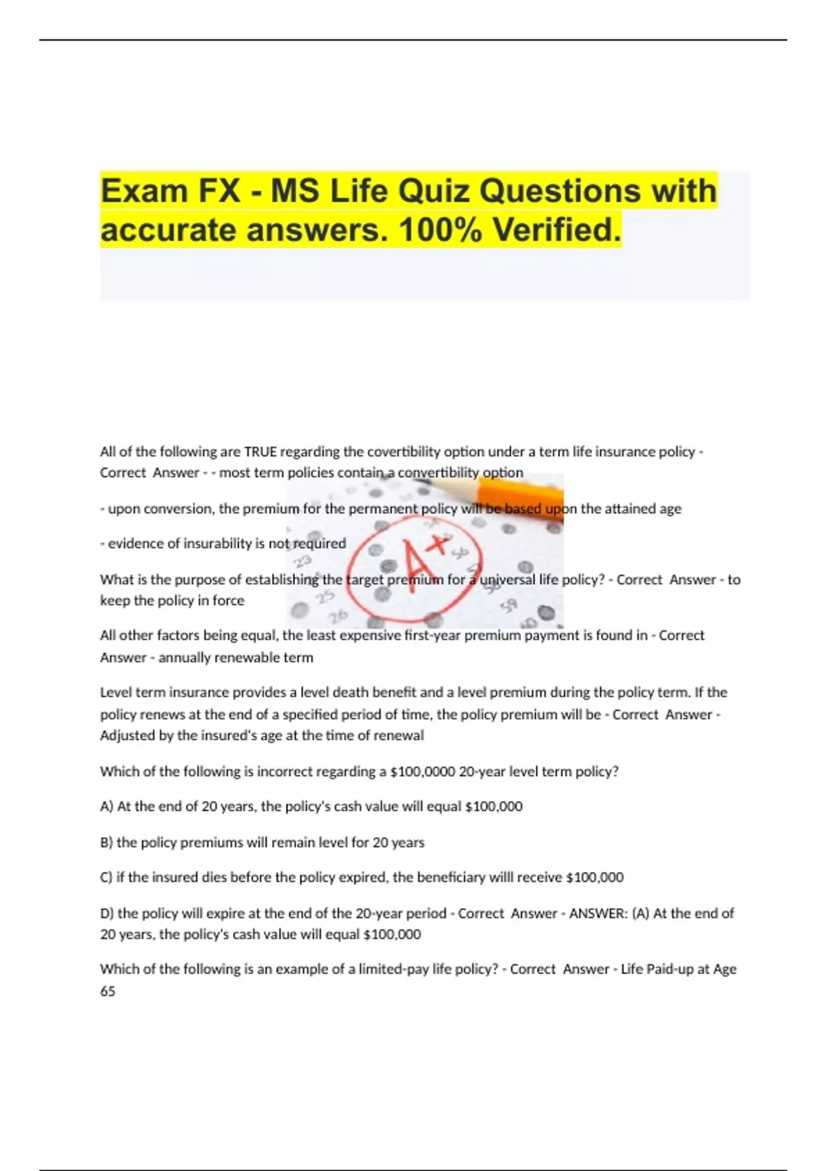 Exam FX - MS Life Quiz Questions with accurate answers. 100% Verified.