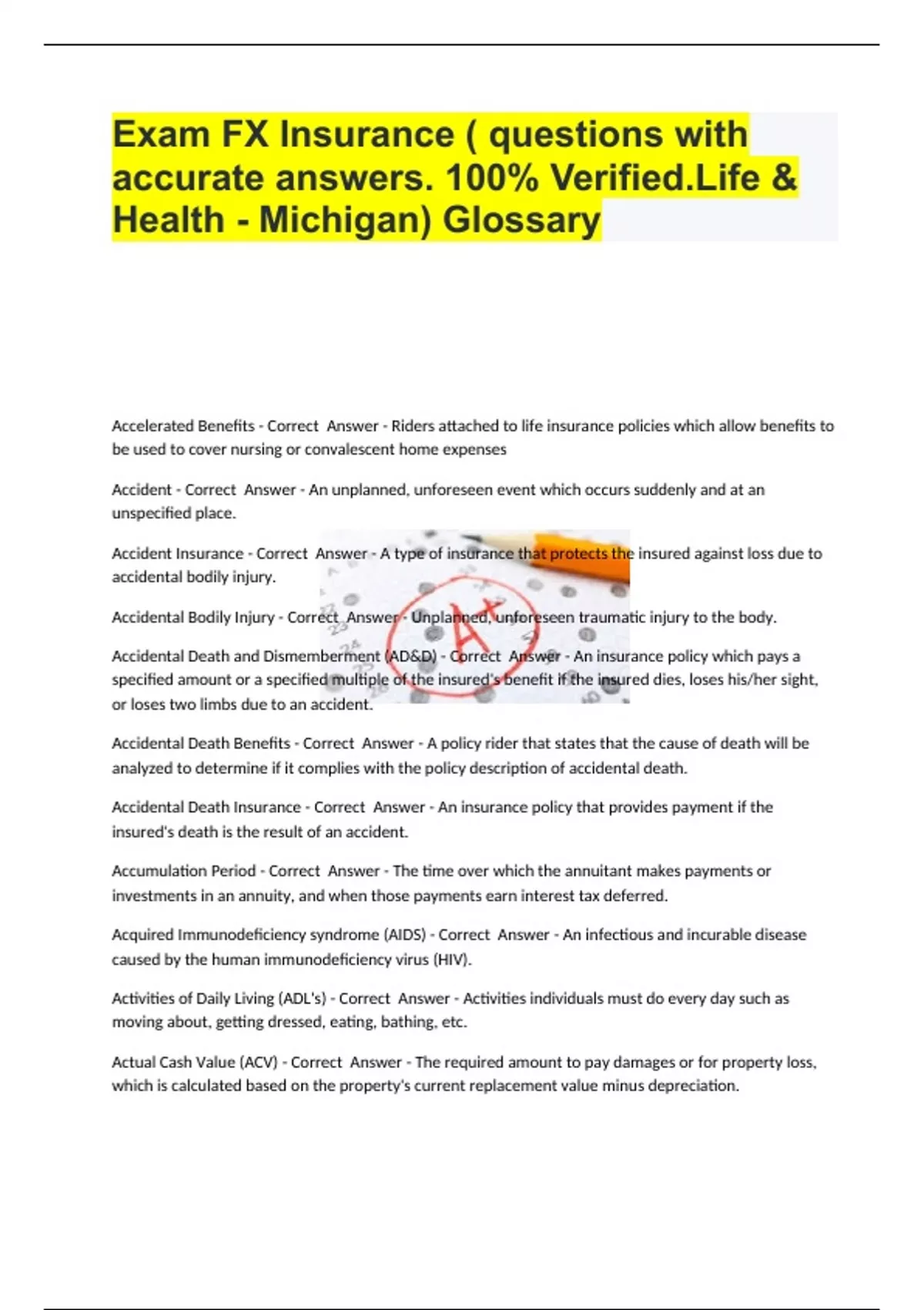 Exam FX Insurance ( questions with accurate answers. 100% Verified.Life & Health - Michigan) Glossary