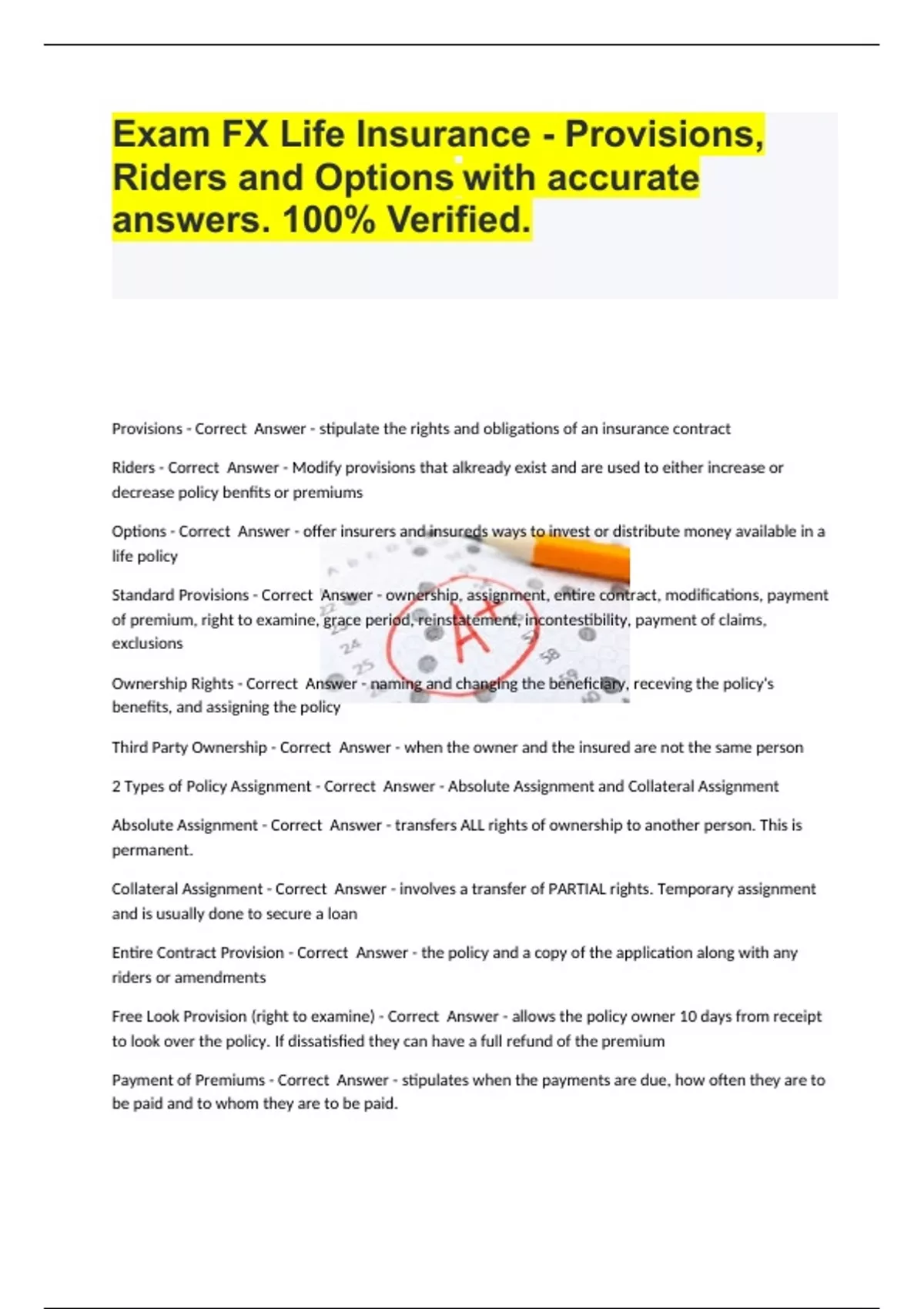 xam FX Life Insurance - Provisions, Riders and Options with accurate answers. 100% Verified..