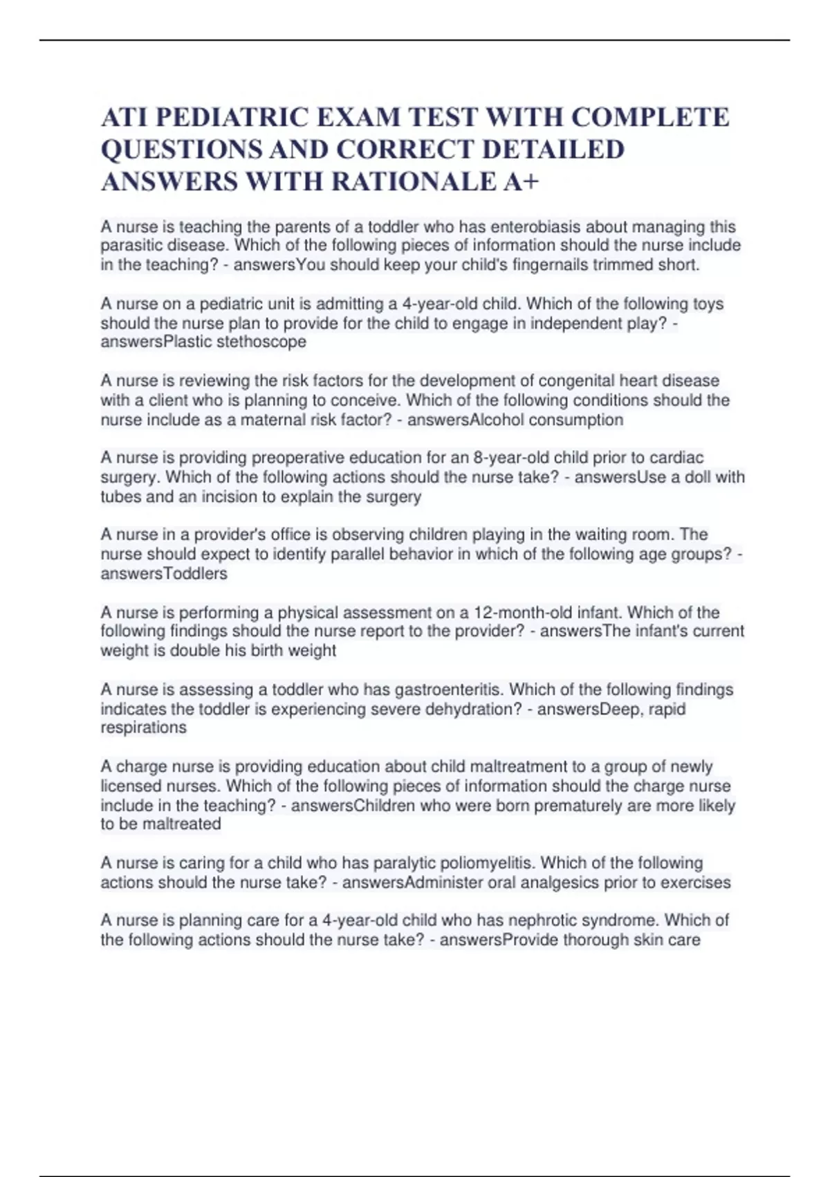 ATI PEDIATRIC EXAM TEST WITH COMPLETE QUESTIONS AND CORRECT DETAILED ANSWERS WITH RATIONALE A+