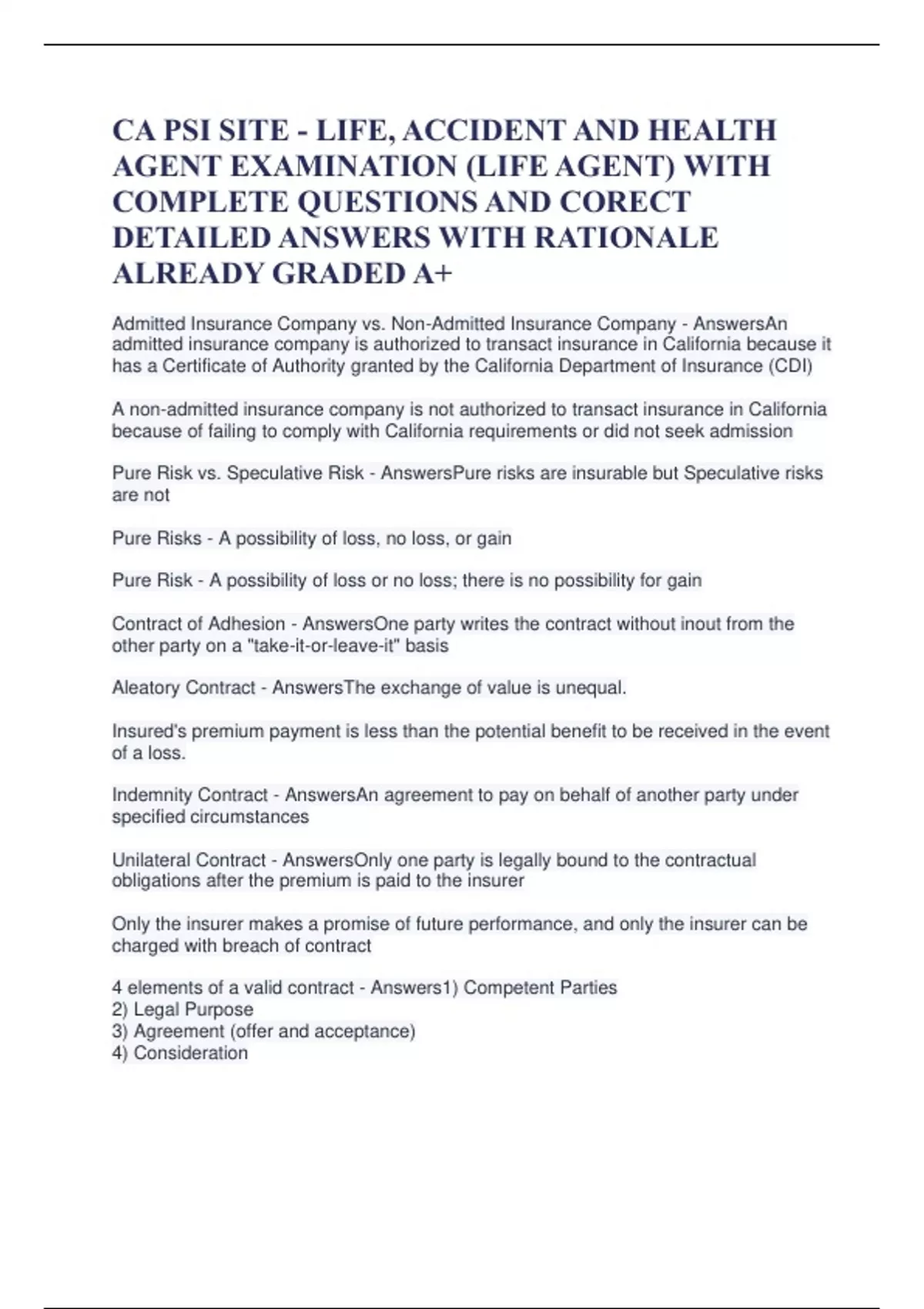 CA PSI SITE - LIFE, ACCIDENT AND HEALTH AGENT EXAMINATION (LIFE AGENT) WITH COMPLETE QUESTIONS AND CORECT DETAILED ANSWERS WITH RATIONALE ALREADY GRADED A+