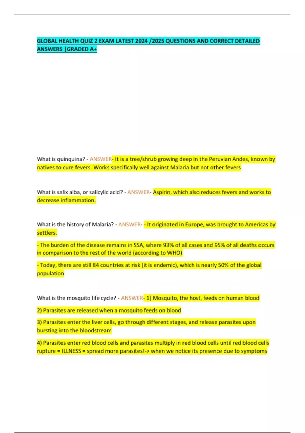 GLOBAL HEALTH QUIZ 2 EXAM LATEST 2024 /2025 QUESTIONS AND CORRECT DETAILED ANSWERS |GRADED A+ What is quinquina? - ANSWER- It is a tree/shrub growing deep in the Peruvian Andes, known by natives to cure fevers. Works specifically well against Malaria but not other fevers. What is salix alba, or salicylic acid? - ANSWER- Aspirin, which also reduces fevers and works to decrease inflammation. What is the history of Malaria? - ANSWER- - It originated in Europe, was brought to Americas by settlers. - The burden of the disease remains in SSA, where 93% of all cases and 95% of all deaths occurs in comparison to the rest of the world (according to WHO) - Today, there are still 84 countries at risk (it is endemic), which is nearly 50% of the global population