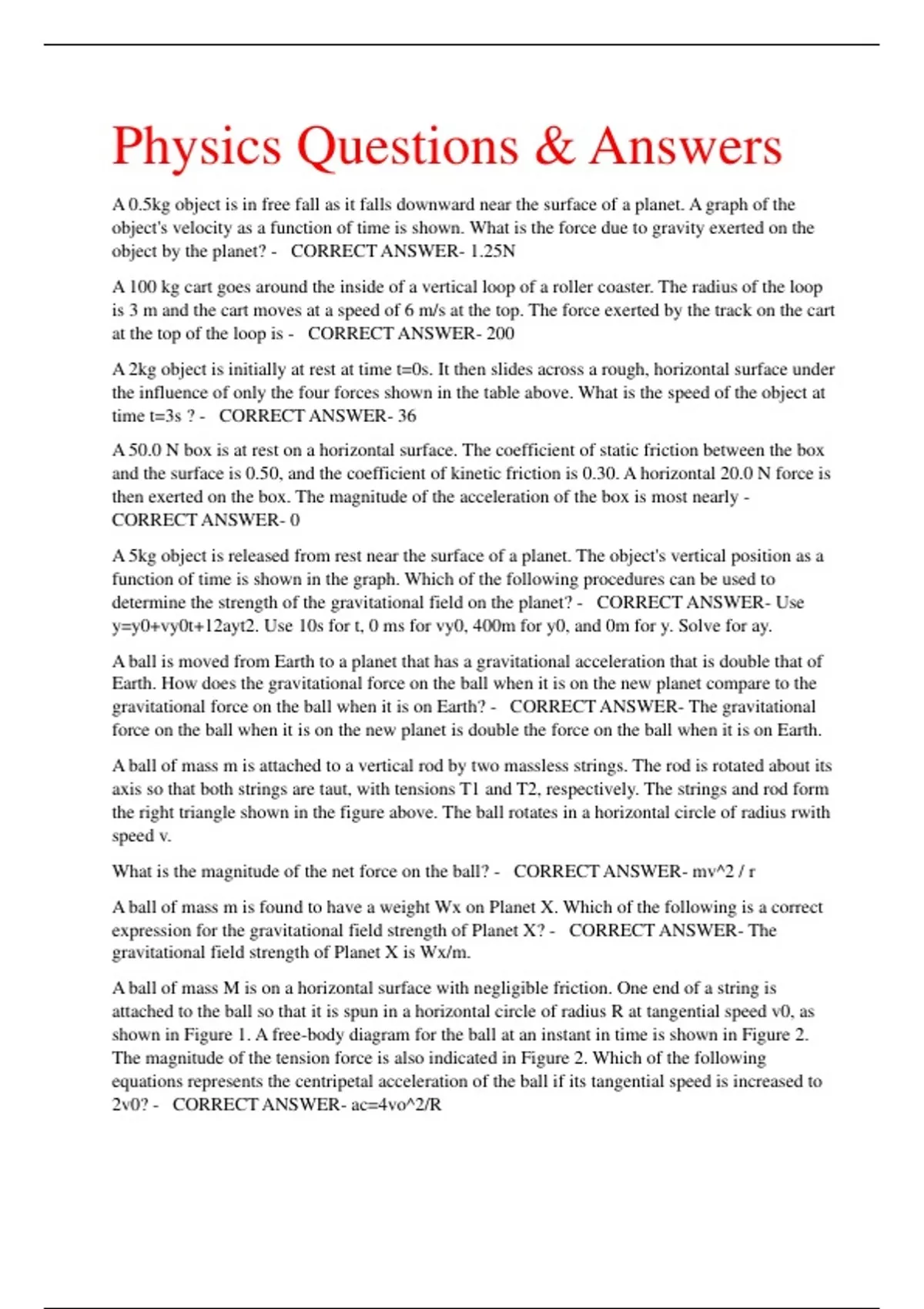 Physics Questions & Answers A 0.5kg object is in free fall as it falls downward near the surface of a planet. A graph of the object's velocity as a function of time is shown. What is the force due to gravity exerted on the object by the planet? - CORRECT ANSWER- 1.25N A 100 kg cart goes around the inside of a vertical loop of a roller coaster. The radius of the loop is 3 m and the cart moves at a speed of 6 m/s at the top. The force exerted by the track on the cart at the top of the loop is - CORRECT ANSWER- 200 A 2kg object is initially at rest at time t=0s. It then slides across a rough, horizontal surface under the influence of only the four forces shown in the table above. What is the speed of the object at time t=3s ? - CORRECT ANSWER- 36 A 50.0 N box is at rest on a horizontal surface. The coefficient of static friction between the box and the surface is 0.50, and the coefficient of kinetic friction is 0.30. A horizontal 20.0 N force is then exerted on the box. The magnitude of the acceleration of the box is most nearly - CORRECT ANSWER- 0 A 5kg object is released from rest near the surface of a planet. The object's vertical position as a function of time is shown in the graph. Which of the following procedures can be used to determine the strength of the gravitational field on the planet? - CORRECT ANSWER- Use y=y0+vy0t+12ayt2. Use 10s for t, 0 ms for vy0, 400m for y0, and 0m for y. Solve for ay. A ball is moved from Earth to a planet that has a gravitational acceleration that is double that of Earth. How does the gravitational force on the ball when it is on the new planet compare to the gravitational force on the ball when it is on Earth? - CORRECT ANSWER- The gravitational force on the ball when it is on the new planet is double the force on the ball when it is on Earth. A ball of mass m is attached to a vertical rod by two massless strings. The rod is rotated about its axis so that both strings are taut, with tensions T1 and T2, respectively. The strings and rod form the right triangle shown in the figure above. The ball rotates in a horizontal circle of radius rwith speed v. What is the magnitude of the net force on the ball? - CORRECT ANSWER- mv^2 / r A ball of mass m is found to have a weight Wx on Planet X. Which of the following is a correct expression for the gravitational field strength of Planet X? - CORRECT ANSWER- The gravitational field strength of Planet X is Wx/m. A ball of mass M is on a horizontal surface with negligible friction. One end of a string is attached to the ball so that it is spun in a horizontal circle of radius R at tangential speed v0, as shown in Figure 1. A free-body diagram for the ball at an instant in time is shown in Figure 2. The magnitude of the tension force is also indicated in Figure 2. Which of the following equations represents the centripetal acceleration of the ball if its tangential speed is increased to 2v0? - CORRECT ANSWER- ac=4vo^2/R