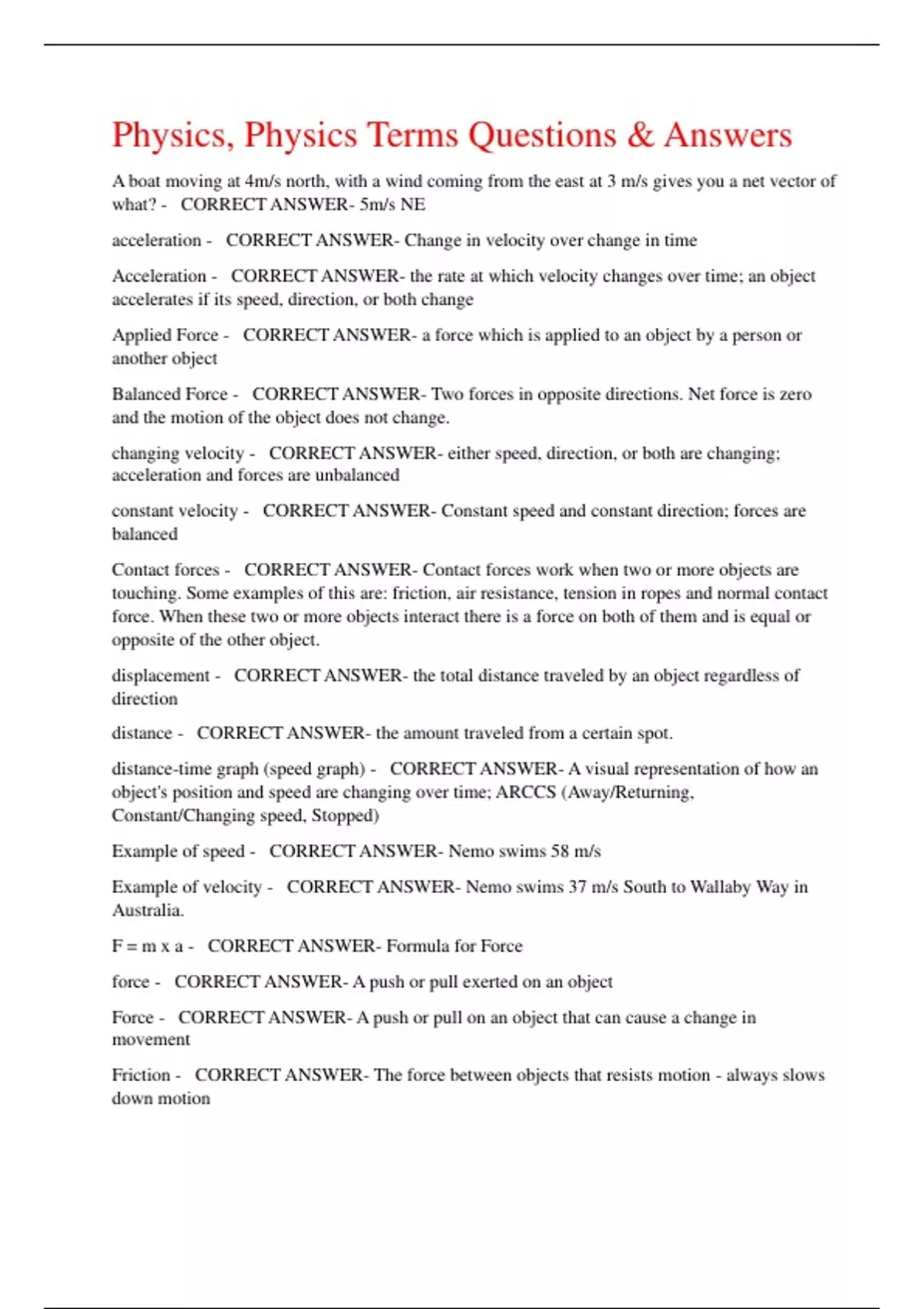 Physics, Physics Terms Questions & Answers A boat moving at 4m/s north, with a wind coming from the east at 3 m/s gives you a net vector of what? - CORRECT ANSWER- 5m/s NE acceleration - CORRECT ANSWER- Change in velocity over change in time Acceleration - CORRECT ANSWER- the rate at which velocity changes over time; an object accelerates if its speed, direction, or both change Applied Force - CORRECT ANSWER- a force which is applied to an object by a person or another object Balanced Force - CORRECT ANSWER- Two forces in opposite directions. Net force is zero and the motion of the object does not change. changing velocity - CORRECT ANSWER- either speed, direction, or both are changing; acceleration and forces are unbalanced constant velocity - CORRECT ANSWER- Constant speed and constant direction; forces are balanced Contact forces - CORRECT ANSWER- Contact forces work when two or more objects are touching. Some examples of this are: friction, air resistance, tension in ropes and normal contact force. When these two or more objects interact there is a force on both of them and is equal or opposite of the other object. displacement - CORRECT ANSWER- the total distance traveled by an object regardless of direction distance - CORRECT ANSWER- the amount traveled from a certain spot. distance-time graph (speed graph) - CORRECT ANSWER- A visual representation of how an object's position and speed are changing over time; ARCCS (Away/Returning, Constant/Changing speed, Stopped) Example of speed - CORRECT ANSWER- Nemo swims 58 m/s Example of velocity - CORRECT ANSWER- Nemo swims 37 m/s South to Wallaby Way in Australia. F = m x a - CORRECT ANSWER- Formula for Force force - CORRECT ANSWER- A push or pull exerted on an obje
