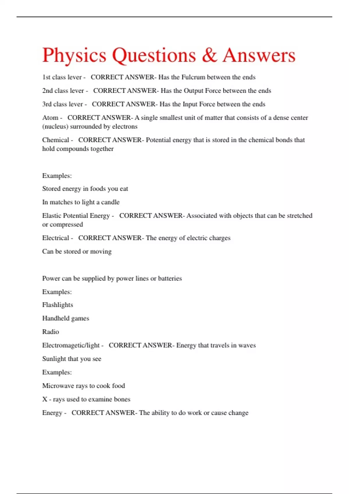 Physics Questions & Answers 1st class lever - CORRECT ANSWER- Has the Fulcrum between the ends 2nd class lever - CORRECT ANSWER- Has the Output Force between the ends 3rd class lever - CORRECT ANSWER- Has the Input Force between the ends Atom - CORRECT ANSWER- A single smallest unit of matter that consists of a dense center (nucleus) surrounded by electrons Chemical - CORRECT ANSWER- Potential energy that is stored in the chemical bonds that hold compounds together Examples: Stored energy in foods you eat In matches to light a candle Elastic Potential Energy - CORRECT ANSWER- Associated with objects that can be stretched or compressed Electrical - CORRECT ANSWER- The energy of electric charges Can be stored or moving Power can be supplied by power lines or batteries Examples: Flashlights Handheld games Radio Electromagetic/light - CORRECT ANSWER- Energy that travels in waves Sunlight that you see Examples: Microwave rays to cook food X - rays used to examine bones Energy - CORRECT ANSWER- The ability to do work or cause change
