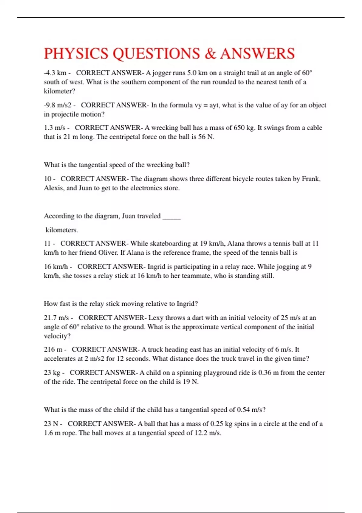 PHYSICS QUESTIONS & ANSWERS -4.3 km - CORRECT ANSWER- A jogger runs 5.0 km on a straight trail at an angle of 60° south of west. What is the southern component of the run rounded to the nearest tenth of a kilometer? -9.8 m/s2 - CORRECT ANSWER- In the formula vy = ayt, what is the value of ay for an object in projectile motion? 1.3 m/s - CORRECT ANSWER- A wrecking ball has a mass of 650 kg. It swings from a cable that is 21 m long. The centripetal force on the ball is 56 N. What is the tangential speed of the wrecking ball? 10 - CORRECT ANSWER- The diagram shows three different bicycle routes taken by Frank, Alexis, and Juan to get to the electronics store. According to the diagram, Juan traveled _____ kilometers. 11 - CORRECT ANSWER- While skateboarding at 19 km/h, Alana throws a tennis ball at 11 km/h to her friend Oliver. If Alana is the reference frame, the speed of the tennis ball is 16 km/h - CORRECT ANSWER- Ingrid is participating in a relay race. While jogging at 9 km/h, she tosses a relay stick at 16 km/h to her teammate, who is standing still. How fast is the relay stick moving relative to Ingrid? 21.7 m/s - CORRECT ANSWER- Lexy throws a dart with an initial velocity of 25 m/s at an angle of 60° relative to the ground. What is the approximate vertical component of the initial velocity? 216 m - CORRECT ANSWER- A truck heading east has an initial velocity of 6 m/s. It accelerates at 2 m/s2 for 12 seconds. What distance does the truck travel in the given time? 23 kg - CORRECT ANSWER- A child on a spinning playground ride is 0.36 m from the center of the ride. The centripetal force on the child is 19 N. What is the mass of the child if the child has a tangential speed of 0.54 m/s? 23 N - CORRECT ANSWER- A ball that has a mass of 0.25 kg spins in a circle at the end of a 1.6 m rope. The ball moves at a tangential speed of 12.2 m/s.