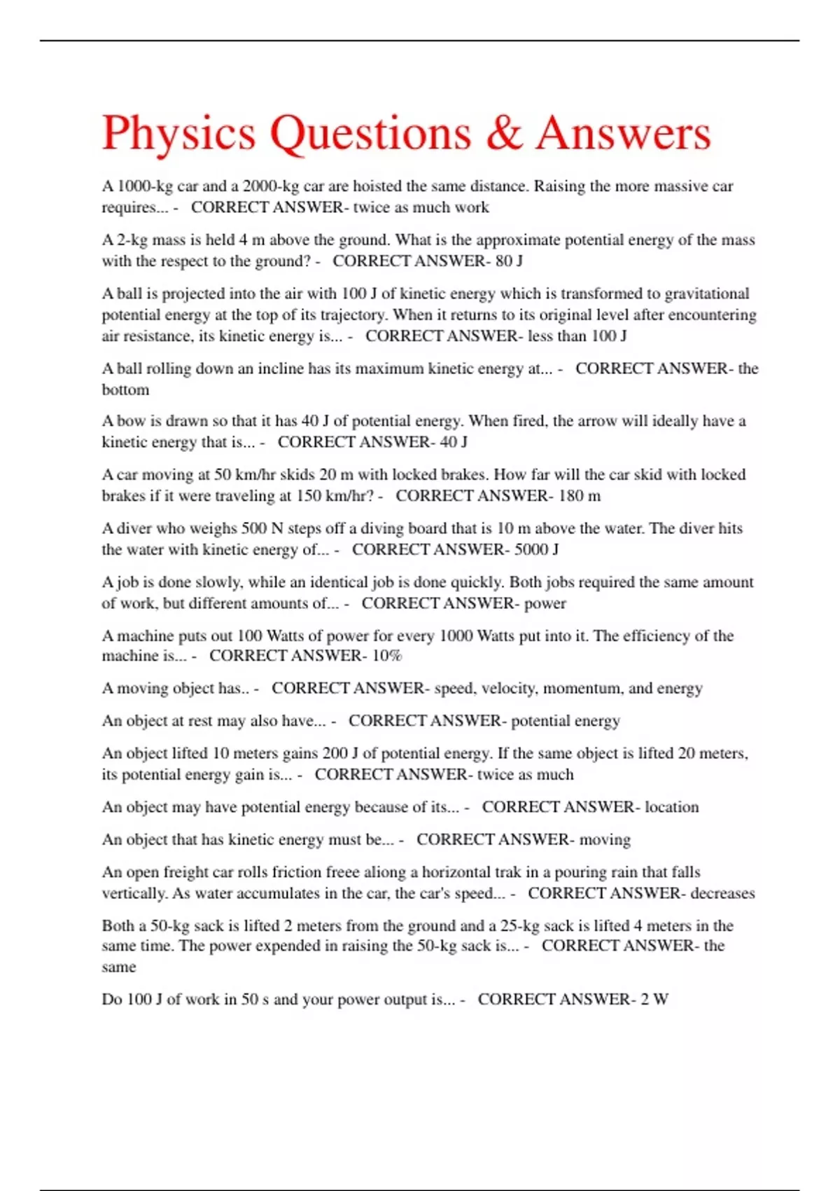 Physics Questions & Answers A 1000-kg car and a 2000-kg car are hoisted the same distance. Raising the more massive car requires... - CORRECT ANSWER- twice as much work A 2-kg mass is held 4 m above the ground. What is the approximate potential energy of the mass with the respect to the ground? - CORRECT ANSWER- 80 J A ball is projected into the air with 100 J of kinetic energy which is transformed to gravitational potential energy at the top of its trajectory. When it returns to its original level after encountering air resistance, its kinetic energy is... - CORRECT ANSWER- less than 100 J A ball rolling down an incline has its maximum kinetic energy at... - CORRECT ANSWER- the bottom A bow is drawn so that it has 40 J of potential energy. When fired, the arrow will ideally have a kinetic energy that is... - CORRECT ANSWER- 40 J A car moving at 50 km/hr skids 20 m with locked brakes. How far will the car skid with locked brakes if it were traveling at 150 km/hr? - CORRECT ANSWER- 180 m A diver who weighs 500 N steps off a diving board that is 10 m above the water. The diver hits the water with kinetic energy of... - CORRECT ANSWER- 5000 J A job is done slowly, while an identical job is done quickly. Both jobs required the same amount of work, but different amounts of... - CORRECT ANSWER- power
