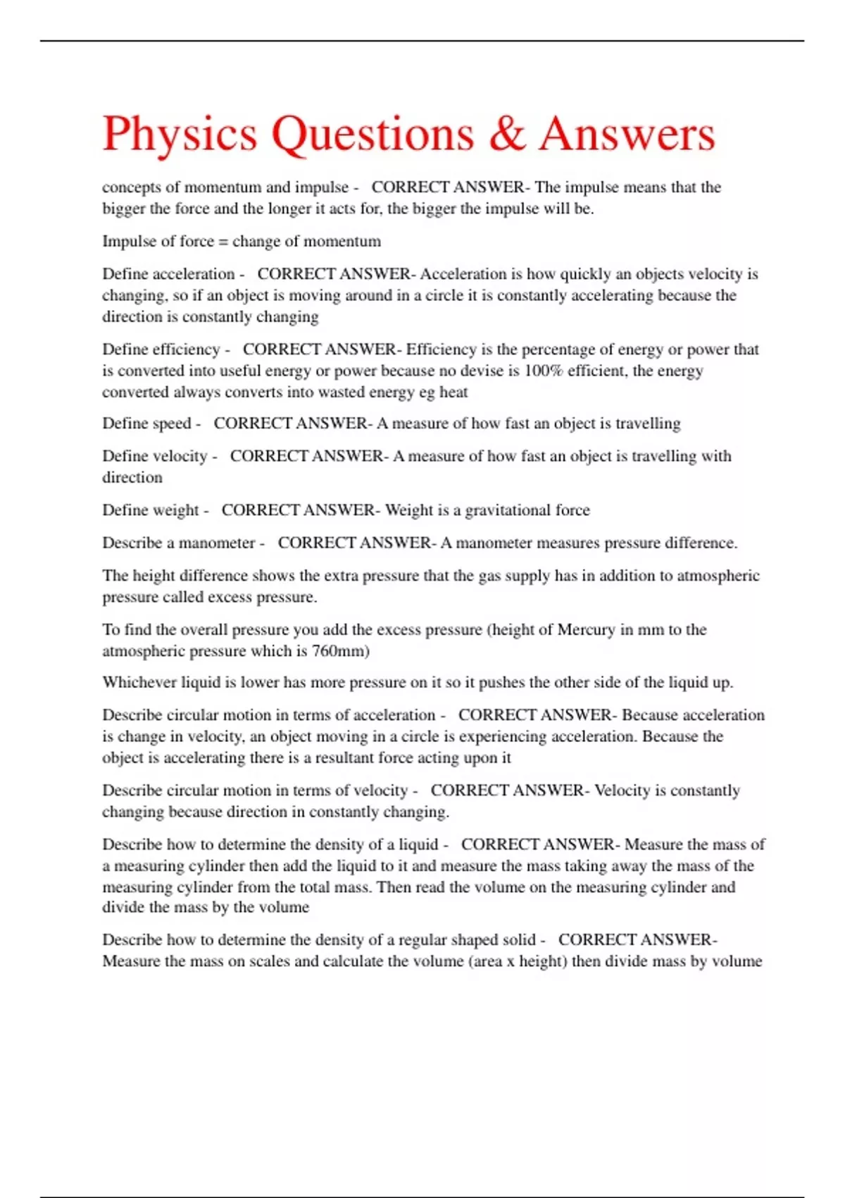 Physics Questions & Answers concepts of momentum and impulse - CORRECT ANSWER- The impulse means that the bigger the force and the longer it acts for, the bigger the impulse will be. Impulse of force = change of momentum Define acceleration - CORRECT ANSWER- Acceleration is how quickly an objects velocity is changing, so if an object is moving around in a circle it is constantly accelerating because the direction is constantly changing Define efficiency - CORRECT ANSWER- Efficiency is the percentage of energy or power that is converted into useful energy or power because no devise is 100% efficient, the energy converted always converts into wasted energy eg heat Define speed - CORRECT ANSWER- A measure of how fast an object is travelling Define velocity - CORRECT ANSWER- A measure of how fast an object is travelling with direction Define weight - CORRECT ANSWER- Weight is a gravitational force Describe a manometer - CORRECT ANSWER- A manometer measures pressure difference. The height difference shows the extra pressure that the gas supply has in addition to atmospheric pressure called excess pressure. To find the overall pressure you add the excess pressure (height of Mercury in mm to the atmospheric pressure which is 760mm) Whichever liquid is lower has more pressure on it so it pushes the other side of the liquid up. Describe circular motion in terms of acceleration - CORRECT ANSWER- Because acceleration is change in velocity, an object moving in a circle is experiencing acceleration. Because the object is accelerating there is a resultant force acting upon it Describe circular motion in terms of velocity - CORRECT ANSWER- Velocity is constantly changing because direction in constantly changing. Describe how to determine the density of a liquid - CORRECT ANSWER- Measure the mass of a measuring cylinder then add the liquid to it and measure the mass taking away the mass of the measuring cylinder from the total mass. Then read the volume on the measuring cylinder and divide the mass by the volume Describe how to determine the density of a regular shaped solid - CORRECT ANSWERMeasure the mass on scales and calculate the volume (area x height) then divide mass by volume