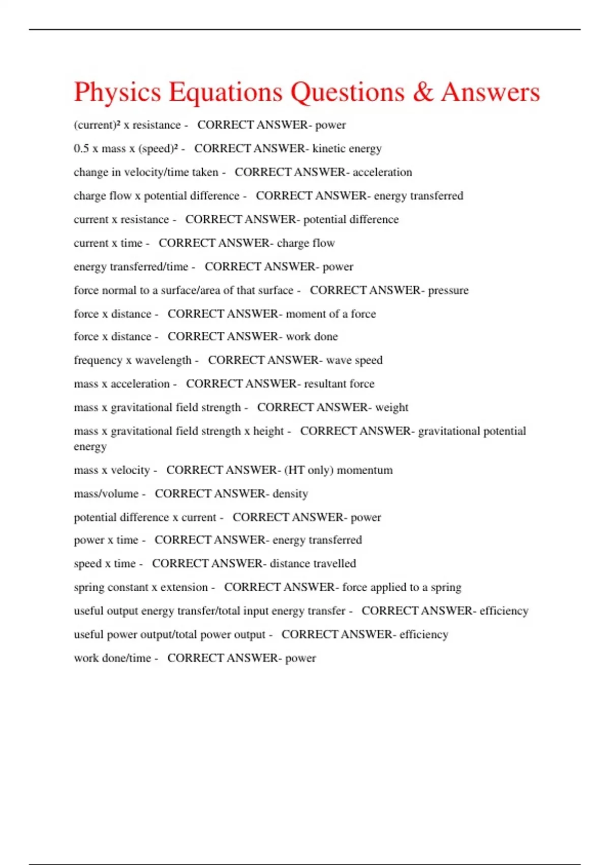 Physics Equations Questions & Answers (current)² x resistance - CORRECT ANSWER- power 0.5 x mass x (speed)² - CORRECT ANSWER- kinetic energy change in velocity/time taken - CORRECT ANSWER- acceleration charge flow x potential difference - CORRECT ANSWER- energy transferred current x resistance - CORRECT ANSWER- potential difference current x time - CORRECT ANSWER- charge flow energy transferred/time - CORRECT ANSWER- power force normal to a surface/area of that surface - CORRECT ANSWER- pressure force x distance - CORRECT ANSWER- moment of a force force x distance - CORRECT ANSWER- work done