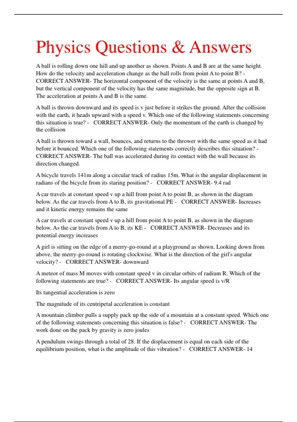 Physics Questions & Answers A ball is rolling down one hill and up another as shown. Points A and B are at the same height. How do the velocity and acceleration change as the ball rolls from point A to point B? - CORRECT ANSWER- The horizontal component of the velocity is the same at points A and B, but the vertical component of the velocity has the same magnitude, but the opposite sign at B. The acceleration at points A and B is the same. A ball is thrown downward and its speed is v just before it strikes the ground. After the collision with the earth, it heads upward with a speed v. Which one of the following statements concerning this situation is true? - CORRECT ANSWER- Only the momentum of the earth is changed by the collision A ball is thrown toward a wall, bounces, and returns to the thrower with the same speed as it had before it bounced. Which one of the following statements correctly describes this situation? - CORRECT ANSWER- The ball was accelerated during its contact with the wall because its direction changed. A bicycle travels 141m along a circular track of radius 15m. What is the angular displacement in radians of the bicycle from its staring position? - CORRECT ANSWER- 9.4 rad A car travels at constant speed v up a hill from point A to point B, as shown in the diagram below. As the car travels from A to B, its gravitational PE - CORRECT ANSWER- Increases and it kinetic energy remains the same A car travels at constant speed v up a hill from point A to point B, as shown in the diagram below. As the car travels from A to B, its KE - CORRECT ANSWER- Decreases and its potential energy increases A girl is sitting on the edge of a merry-go-round at a playground as shown. Looking down from above, the merry-go-round is rotating clockwise. What is the direction of the girl's angular velocity? - CORRECT ANSWER- downward A meteor of mass M moves with constant speed v in circular orbits of radium R. Which of the following statements are true? - CORRECT ANSWER- Its angular speed is v/R Its tangential acceleration is zero The magnitude of its centripetal acceleration is constant A mountain climber pulls a supply pack up the side of a mountain at a constant speed. Which one of the following statements concerning this situation is false? - CORRECT ANSWER- The work done on the pack by gravity is zero joules A pendulum swings through a total of 28. If the displacement is equal on each side of the equilibrium position, what is the amplitude of this vibration? - CORRECT ANSWER- 14