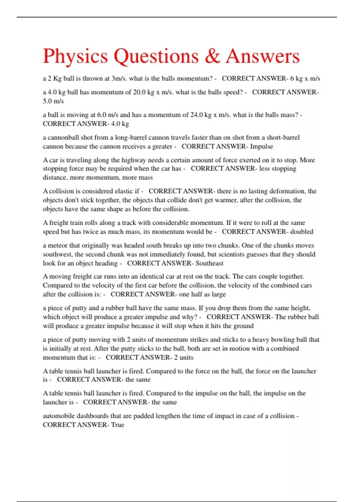 Physics Questions & Answers a 2 Kg ball is thrown at 3m/s. what is the balls momentum? - CORRECT ANSWER- 6 kg x m/s a 4.0 kg ball has momentum of 20.0 kg x m/s. what is the balls speed? - CORRECT ANSWER5.0 m/s a ball is moving at 6.0 m/s and has a momentum of 24.0 kg x m/s. what is the balls mass? - CORRECT ANSWER- 4.0 kg a cannonball shot from a long-barrel cannon travels faster than on shot from a short-barrel cannon because the cannon receives a greater - CORRECT ANSWER- Impulse A car is traveling along the highway needs a certain amount of force exerted on it to stop. More stopping force may be required when the car has - CORRECT ANSWER- less stopping distance, more momentum, more mass A collision is considered elastic if - CORRECT ANSWER- there is no lasting deformation, the objects don't stick together, the objects that collide don't get warmer, after the collision, the objects have the same shape as before the collision. A freight train rolls along a track with considerable momentum. If it were to roll at the same speed but has twice as much mass, its momentum would be - CORRECT ANSWER- doubled a meteor that originally was headed south breaks up into two chunks. One of the chunks moves southwest, the second chunk was not immediately found, but scientists guesses that they should look for an object heading - CORRECT ANSWER- Southeast A moving freight car runs into an identical car at rest on the track. The cars couple together. Compared to the velocity of the first car before the collision, the velocity of the combined cars after the collision is: - CORRECT ANSWER- one half as large a piece of putty and a rubber ball have the same mass. If you drop them from the same height, which object will produce a greater impulse and why? - CORRECT ANSWER- The rubber ball will produce a greater impulse because it will stop when it hits the ground