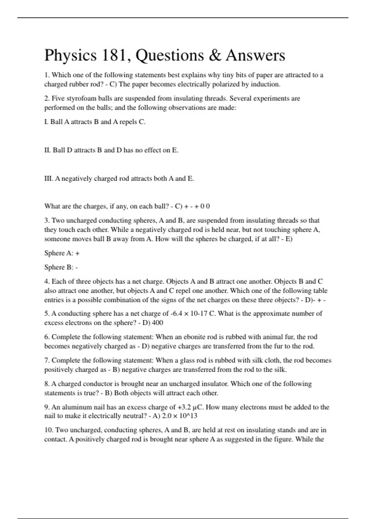 Physics 181, Questions & Answers 1. Which one of the following statements best explains why tiny bits of paper are attracted to a charged rubber rod? - C) The paper becomes electrically polarized by induction. 2. Five styrofoam balls are suspended from insulating threads. Several experiments are performed on the balls; and the following observations are made: I. Ball A attracts B and A repels C. II. Ball D attracts B and D has no effect on E. III. A negatively charged rod attracts both A and E. What are the charges, if any, on each ball? - C) + - + 0 0 3. Two uncharged conducting spheres, A and B, are suspended from insulating threads so that they touch each other. While a negatively charged rod is held near, but not touching sphere A, someone moves ball B away from A. How will the spheres be charged, if at all? - E) Sphere A: + Sphere B: - 4. Each of three objects has a net charge. Objects A and B attract one another. Objects B and C also attract one another, but objects A and C repel one another. Which one of the following table entries is a possible combination of the signs of the net charges on these three objects? - D)- + - 5. A conducting sphere has a net charge of -6.4 × 10-17 C. What is the approximate number of excess electrons on the sphere? - D) 400 6. Complete the following statement: When an ebonite rod is rubbed with animal fur, the rod becomes negatively charged as - D) negative charges are transferred from the fur to the rod. 7. Complete the following statement: When a glass rod is rubbed with silk cloth, the rod becomes positively charged as - B) negative charges are transferred from the rod to the silk. 8. A charged conductor is brought near an uncharged insulator. Which one of the following statements is true? - B) Both objects will attract each other. 9. An aluminum nail has an excess charge of +3.2 µC. How many electrons must be added to the nail to make it electrically neutral? - A) 2.0 × 10^13 10. Two uncharged, conducting spheres, A and B, are held at rest on insulating stands and are in contact. A positively charged rod is brought near sphere A as suggested in the figure. While the rod is in place, someone moves sphere B away from A. How will the spheres be charged, if at all? - C) Sphere A: negative Sphere B: positive 11. Consider three identical metal spheres, A, B, and C. Sphere A carries a charge of -2.0 µC; sphere B carries a charge of -6.0 µC; and sphere C carries a charge of +4.0 µC. Spheres A and B are touched together and then separated. Spheres B and C are then touched and separated. Does sphere C end up with an excess or a deficiency of electrons and how many electrons is it? - E) There is no excess or deficiency of electrons. 12. Two charged particles A and B are located near one another. Both the magnitude and direction of the force that particle A exerts on particle B is independent of - E)