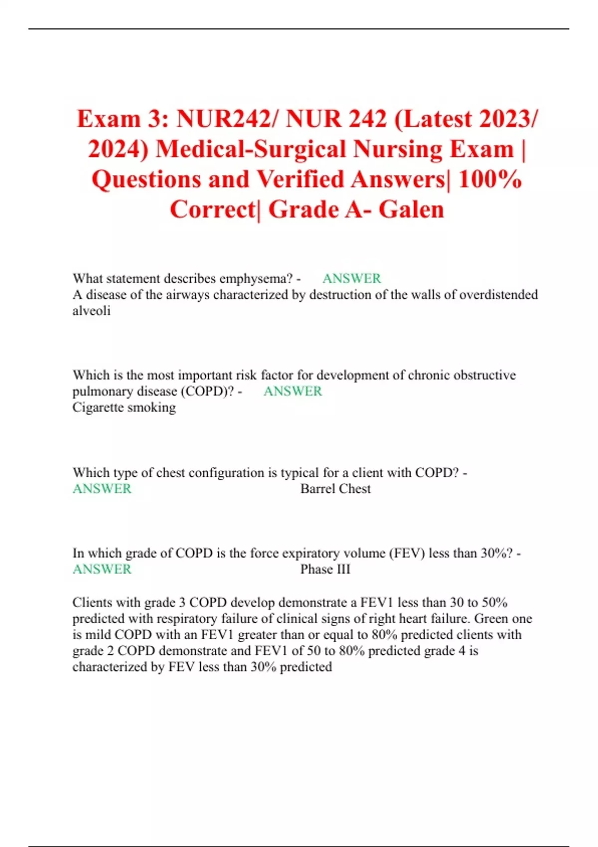 Exam 3: NUR242/ NUR 242 (Latest 2023/ 2024) Medical-Surgical Nursing Exam | Questions and Verified Answers| 100% Correct| Grade A- Galen