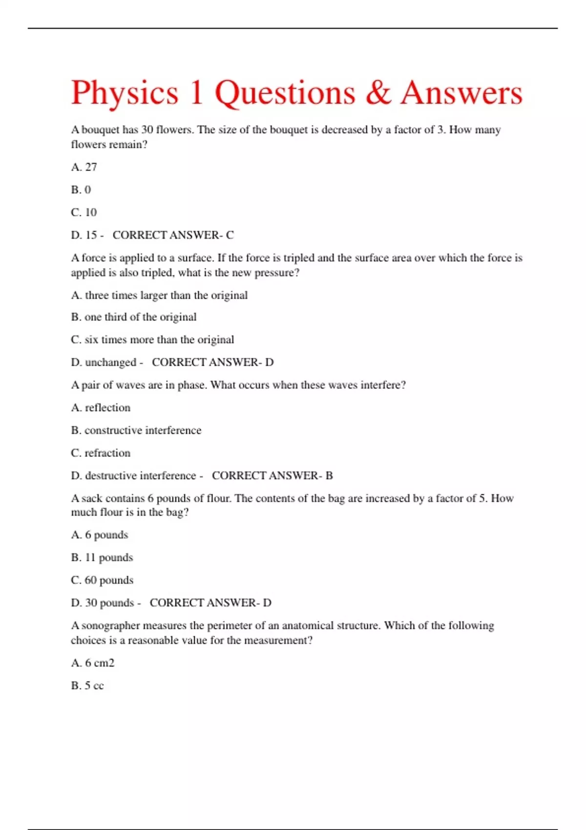 Physics 1 Questions & Answers A bouquet has 30 flowers. The size of the bouquet is decreased by a factor of 3. How many flowers remain? A. 27 B. 0 C. 10 D. 15 - CORRECT ANSWER- C A force is applied to a surface. If the force is tripled and the surface area over which the force is applied is also tripled, what is the new pressure? A. three times larger than the original B. one third of the original C. six times more than the original D. unchanged - CORRECT ANSWER- D A pair of waves are in phase. What occurs when these waves interfere? A. reflection B. constructive interference C. refraction D. destructive interference - CORRECT ANSWER- B A sack contains 6 pounds of flour. The contents of the bag are increased by a factor of 5. How much flour is in the bag? A. 6 pounds B. 11 pounds C. 60 pounds D. 30 pounds - CORRECT ANSWER- D A sonographer measures the perimeter of an anatomical structure. Which of the following choices is a reasonable value for the measurement? A. 6 cm2 B. 5 cc C. 15 mm D. 18 dB - CORRECT ANSWER- C
